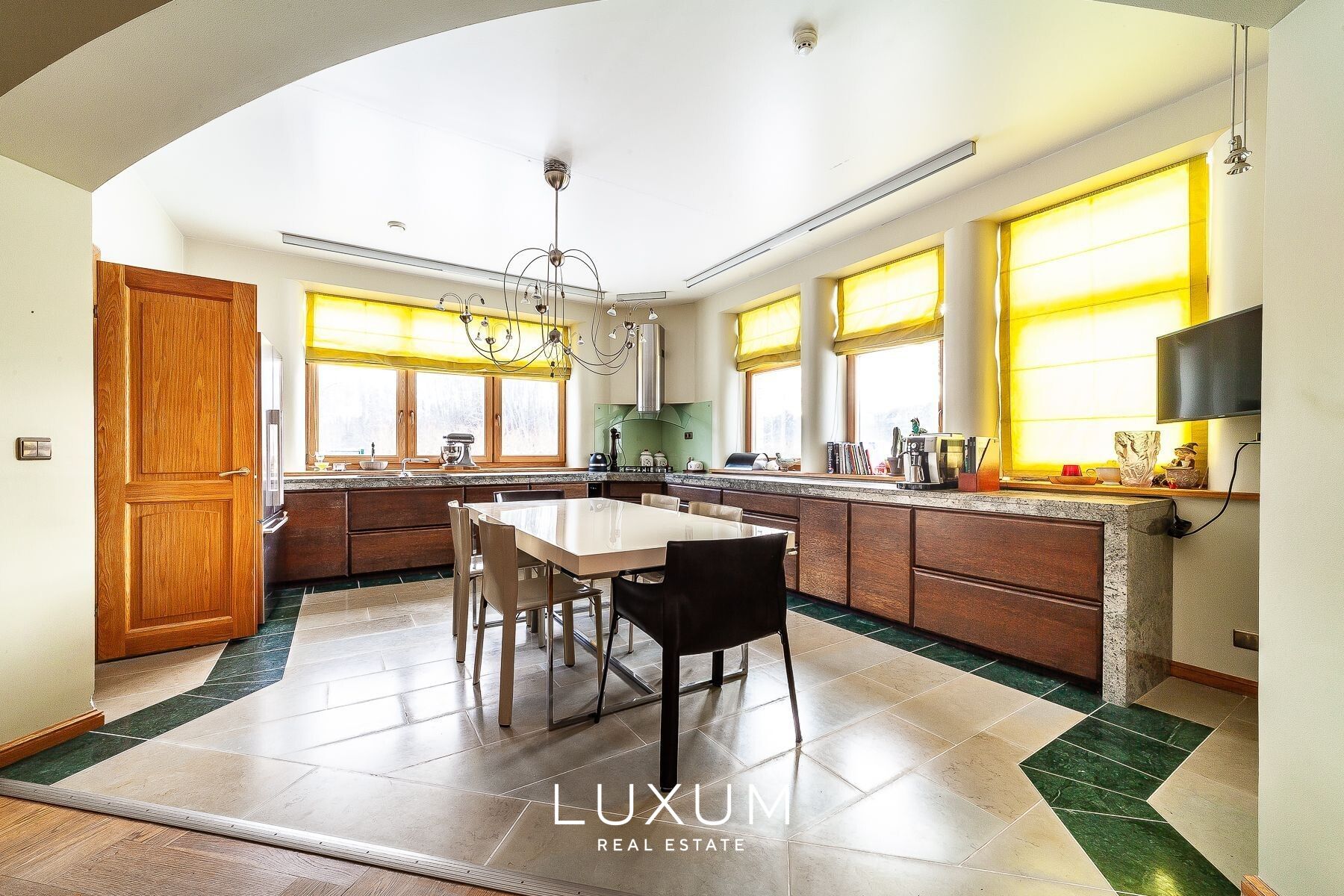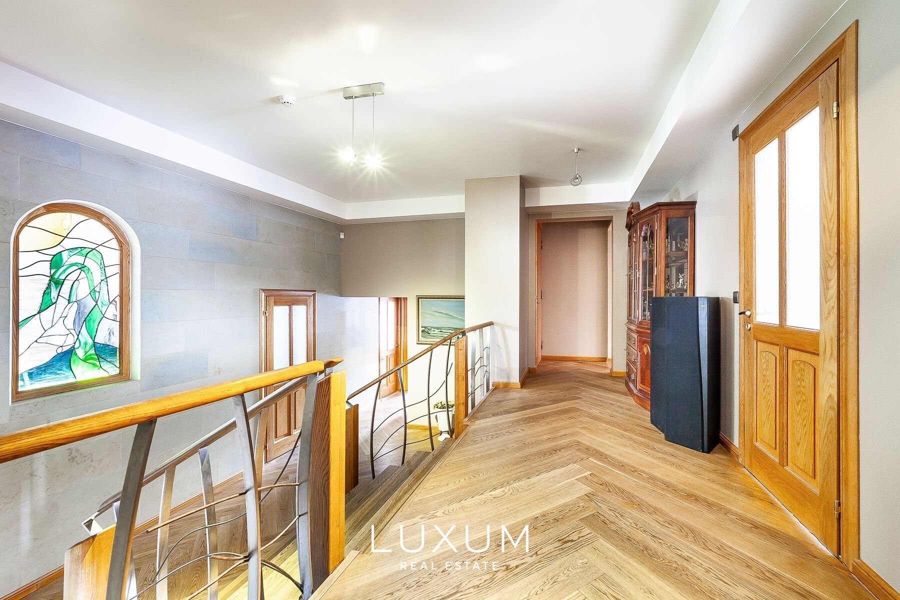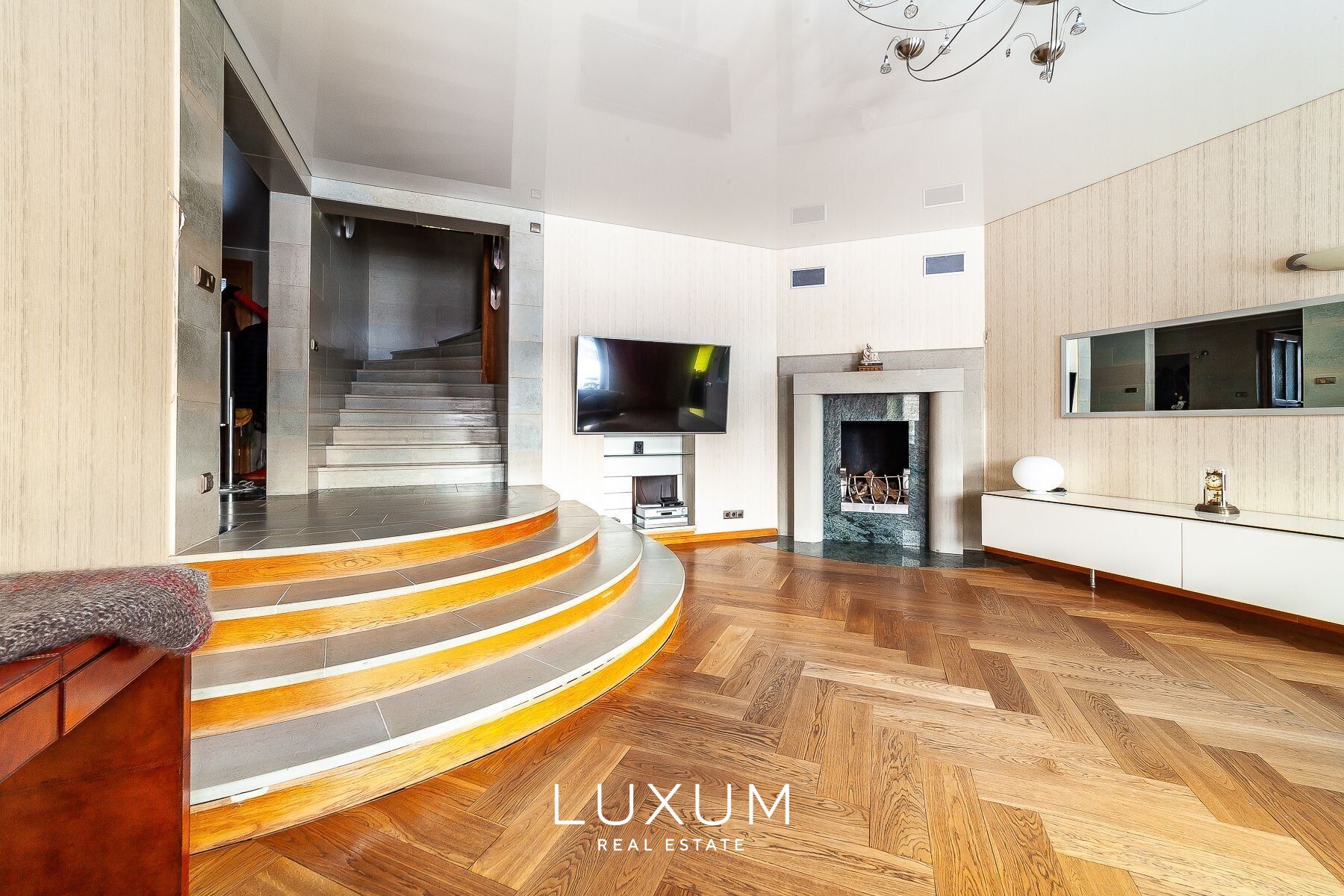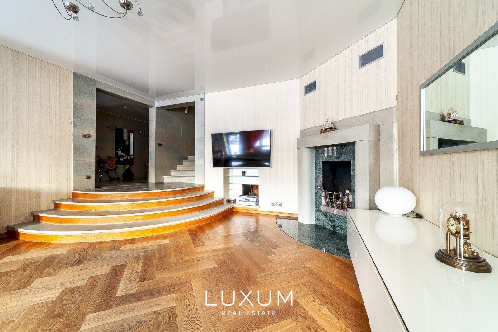 The residence offers a total interior area of 702,75 m², complemented by a 40 m² auxiliary building. The first floor is designed for representational living and shared family moments – a 39,5 m² light-filled living room opens toward the southern sun and river views, anchored by a stately marble fireplace. The 36,92 m² kitchen and dining area, finished with natural marble surfaces and supported by a separate utility room, combines scale with functionality. A 53,11 m² spa complex enhances the sense of private wellness. Direct access from the 39,59 m² two-car garage into the entrance hall ensures everyday convenience.