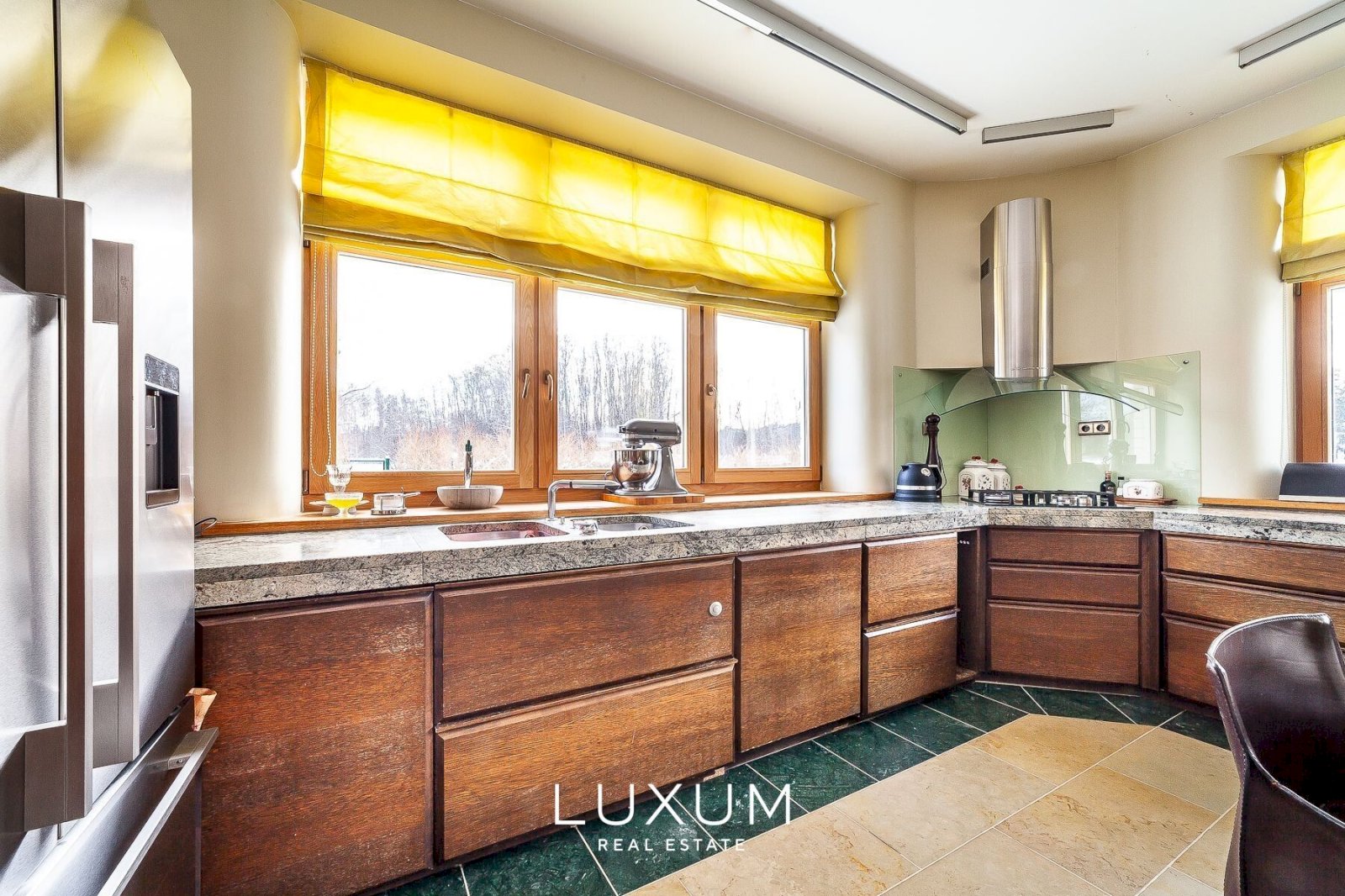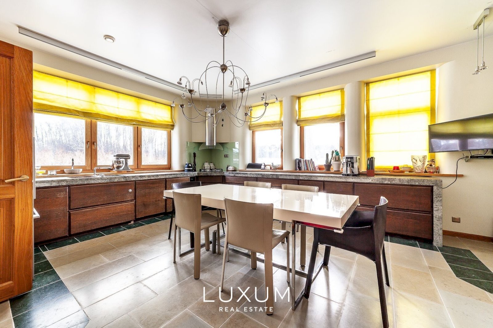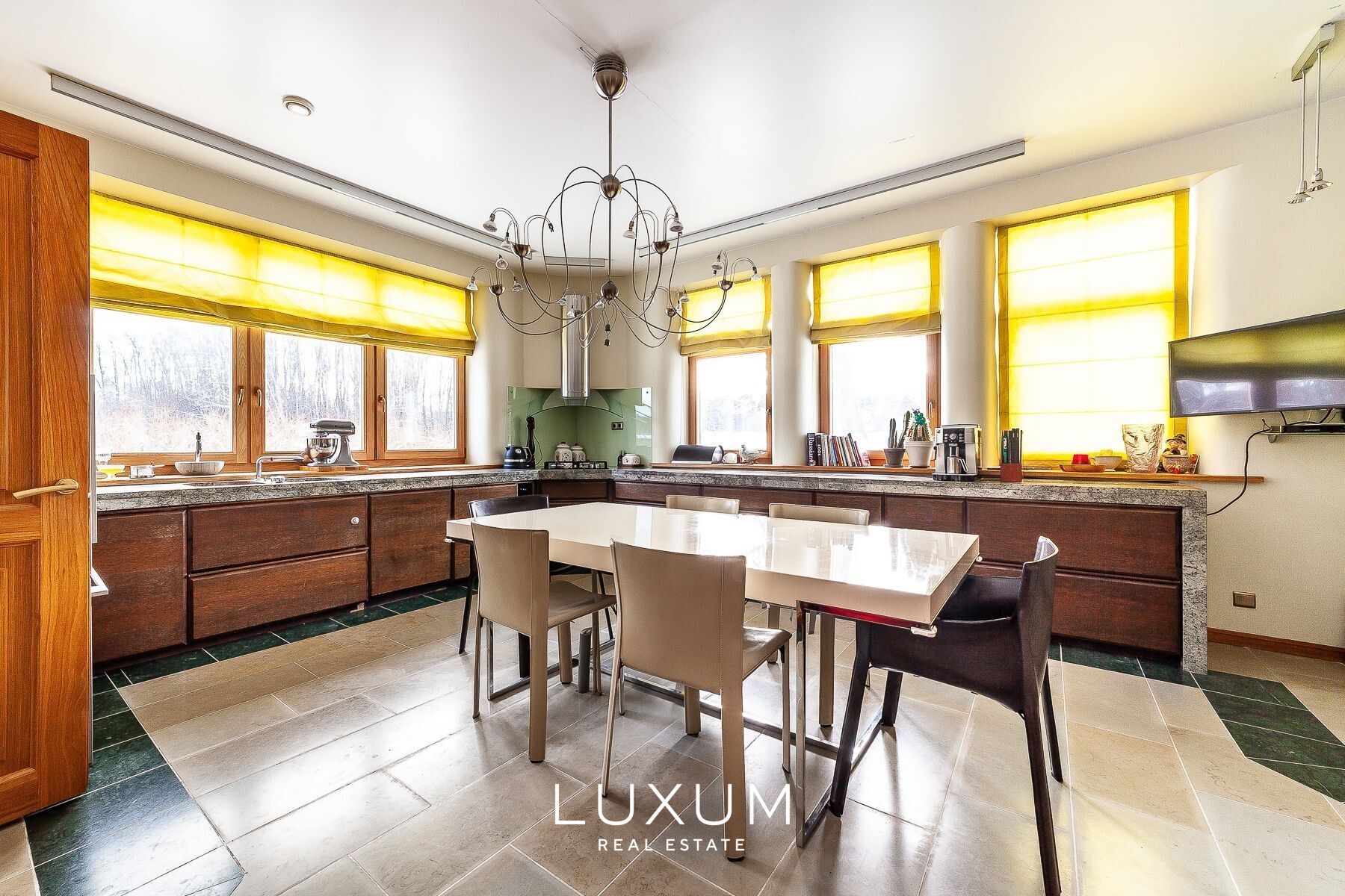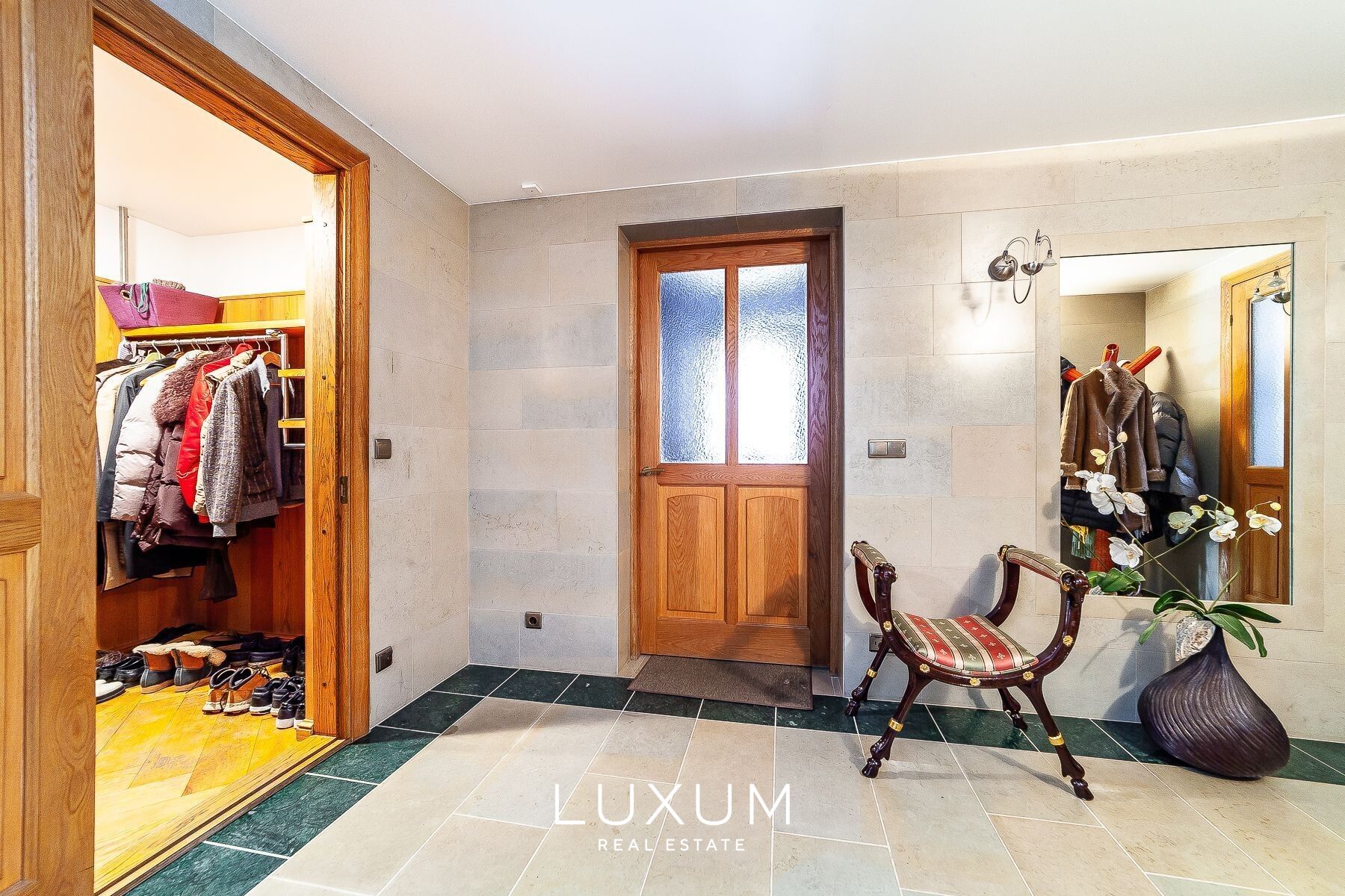 The residence offers a total interior area of 702,75 m², complemented by a 40 m² auxiliary building. The first floor is designed for representational living and shared family moments – a 39,5 m² light-filled living room opens toward the southern sun and river views, anchored by a stately marble fireplace. The 36,92 m² kitchen and dining area, finished with natural marble surfaces and supported by a separate utility room, combines scale with functionality. A 53,11 m² spa complex enhances the sense of private wellness. Direct access from the 39,59 m² two-car garage into the entrance hall ensures everyday convenience.