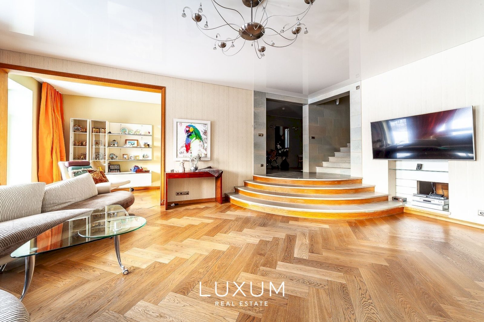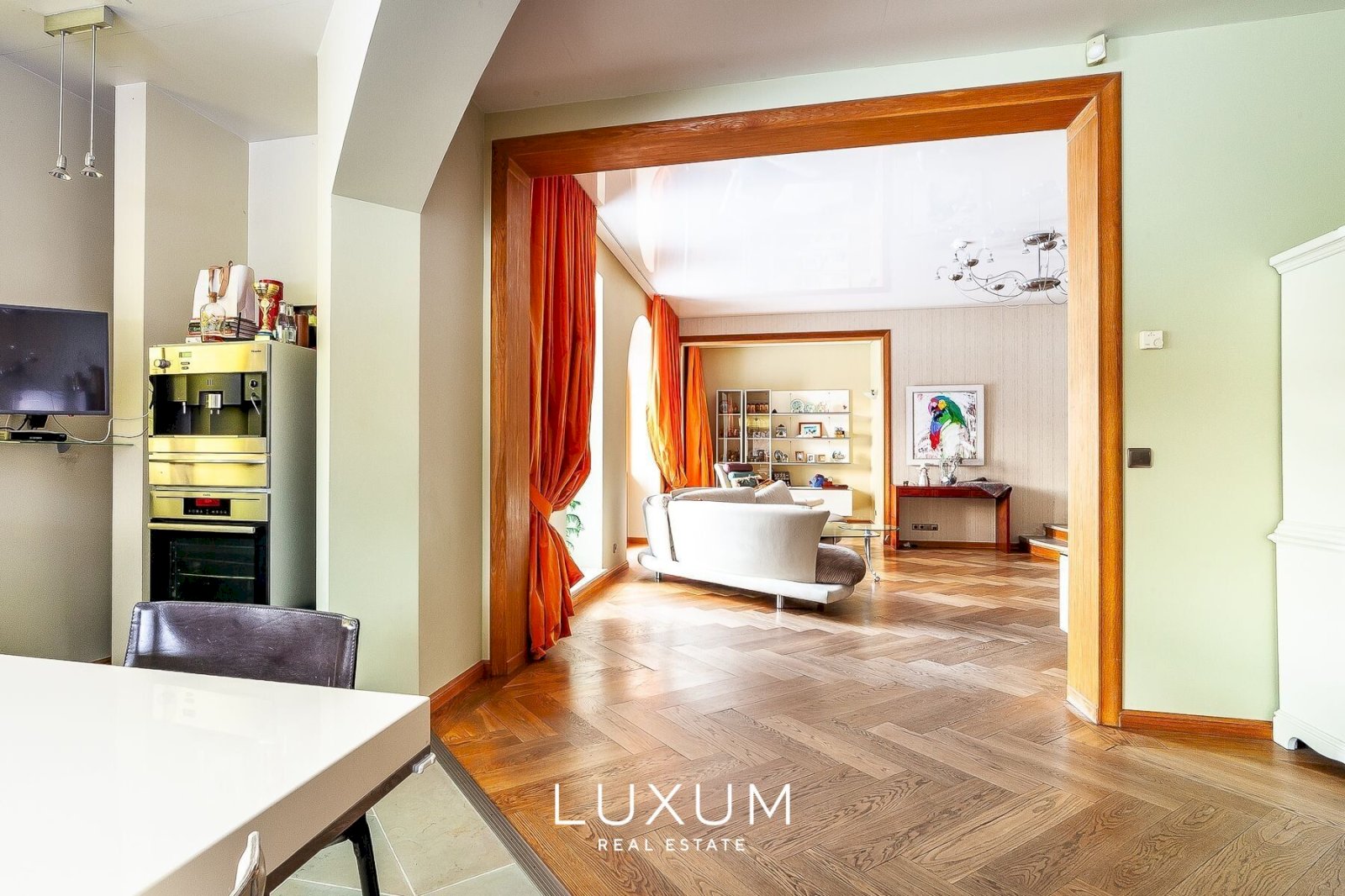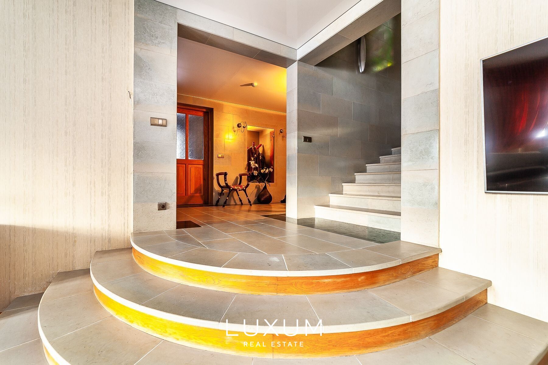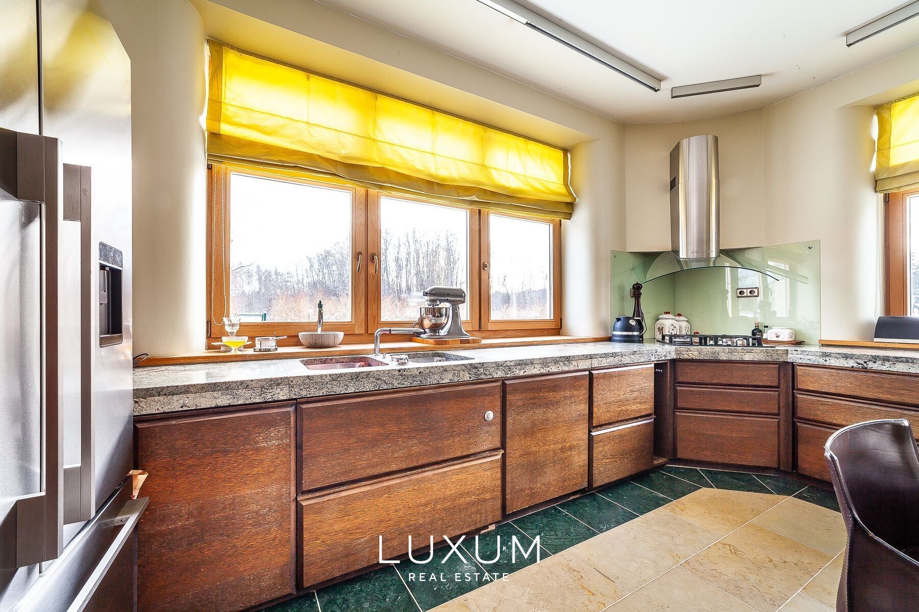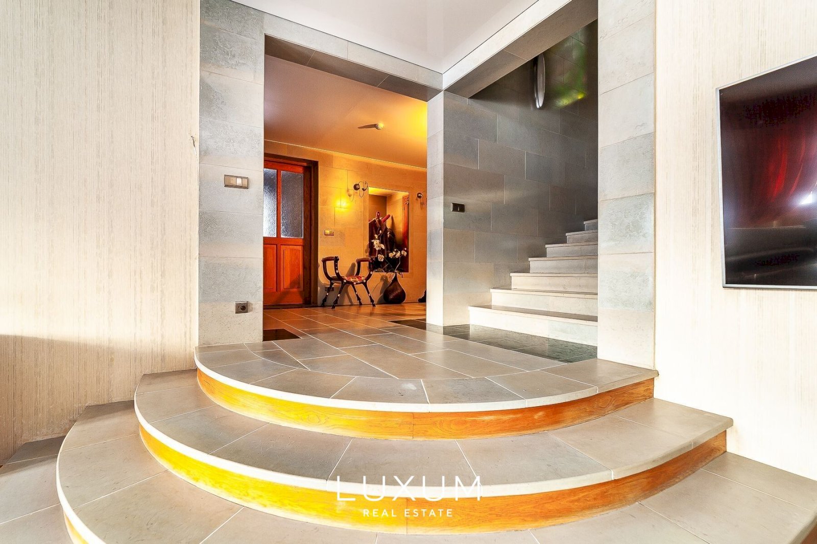 The residence offers a total interior area of 702,75 m², complemented by a 40 m² auxiliary building. The first floor is designed for representational living and shared family moments – a 39,5 m² light-filled living room opens toward the southern sun and river views, anchored by a stately marble fireplace. The 36,92 m² kitchen and dining area, finished with natural marble surfaces and supported by a separate utility room, combines scale with functionality. A 53,11 m² spa complex enhances the sense of private wellness. Direct access from the 39,59 m² two-car garage into the entrance hall ensures everyday convenience.