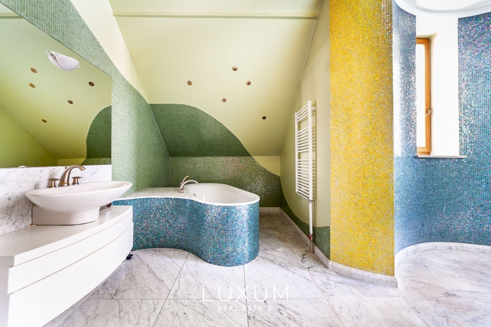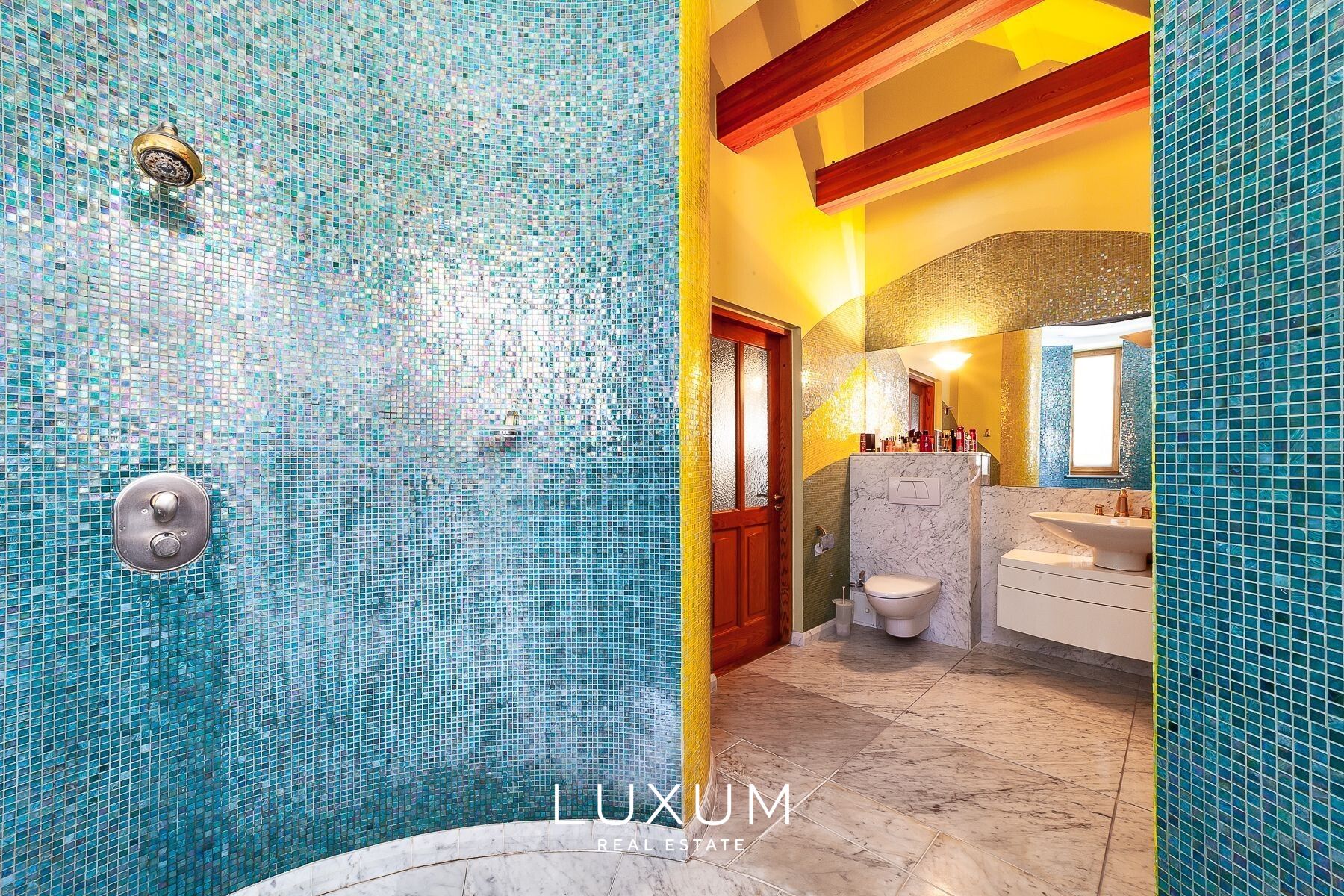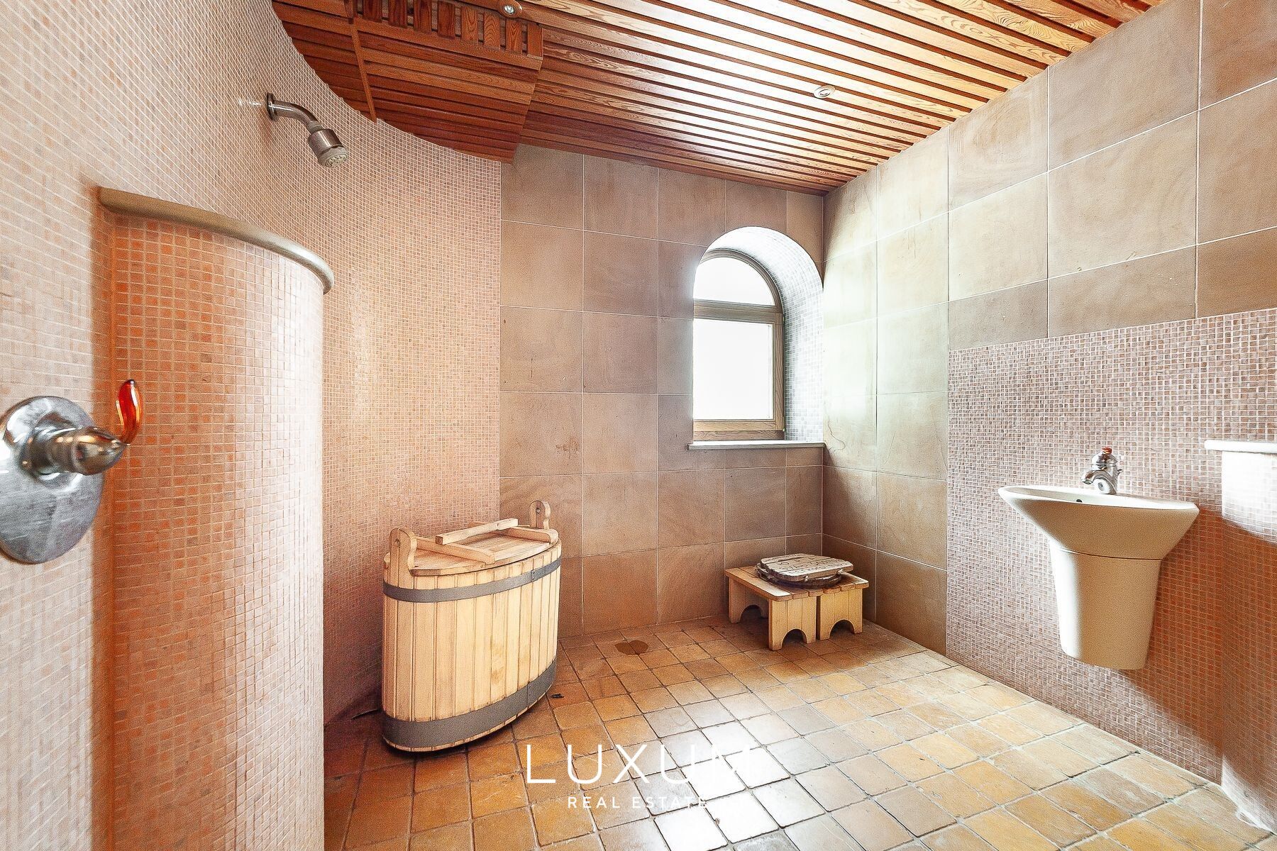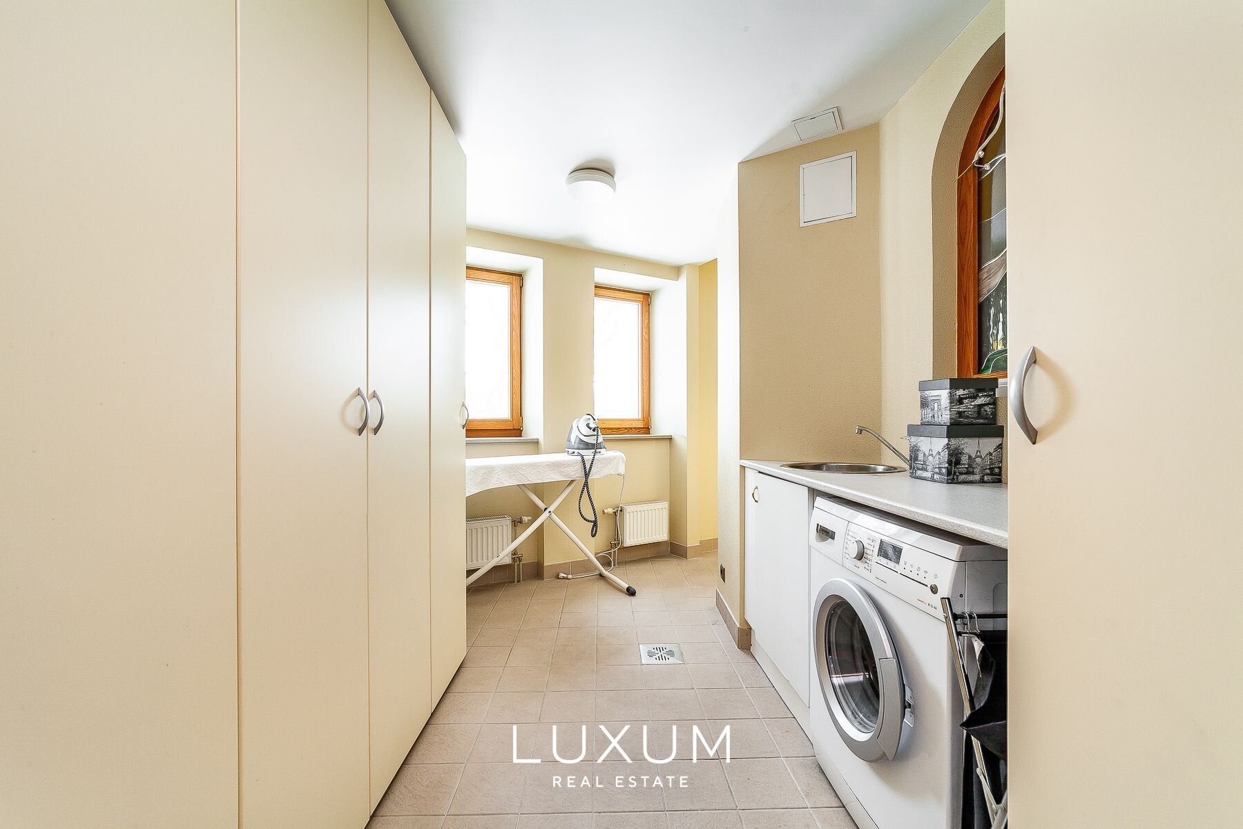 The residence offers a total interior area of 702,75 m², complemented by a 40 m² auxiliary building. The first floor is designed for representational living and shared family moments – a 39,5 m² light-filled living room opens toward the southern sun and river views, anchored by a stately marble fireplace. The 36,92 m² kitchen and dining area, finished with natural marble surfaces and supported by a separate utility room, combines scale with functionality. A 53,11 m² spa complex enhances the sense of private wellness. Direct access from the 39,59 m² two-car garage into the entrance hall ensures everyday convenience.