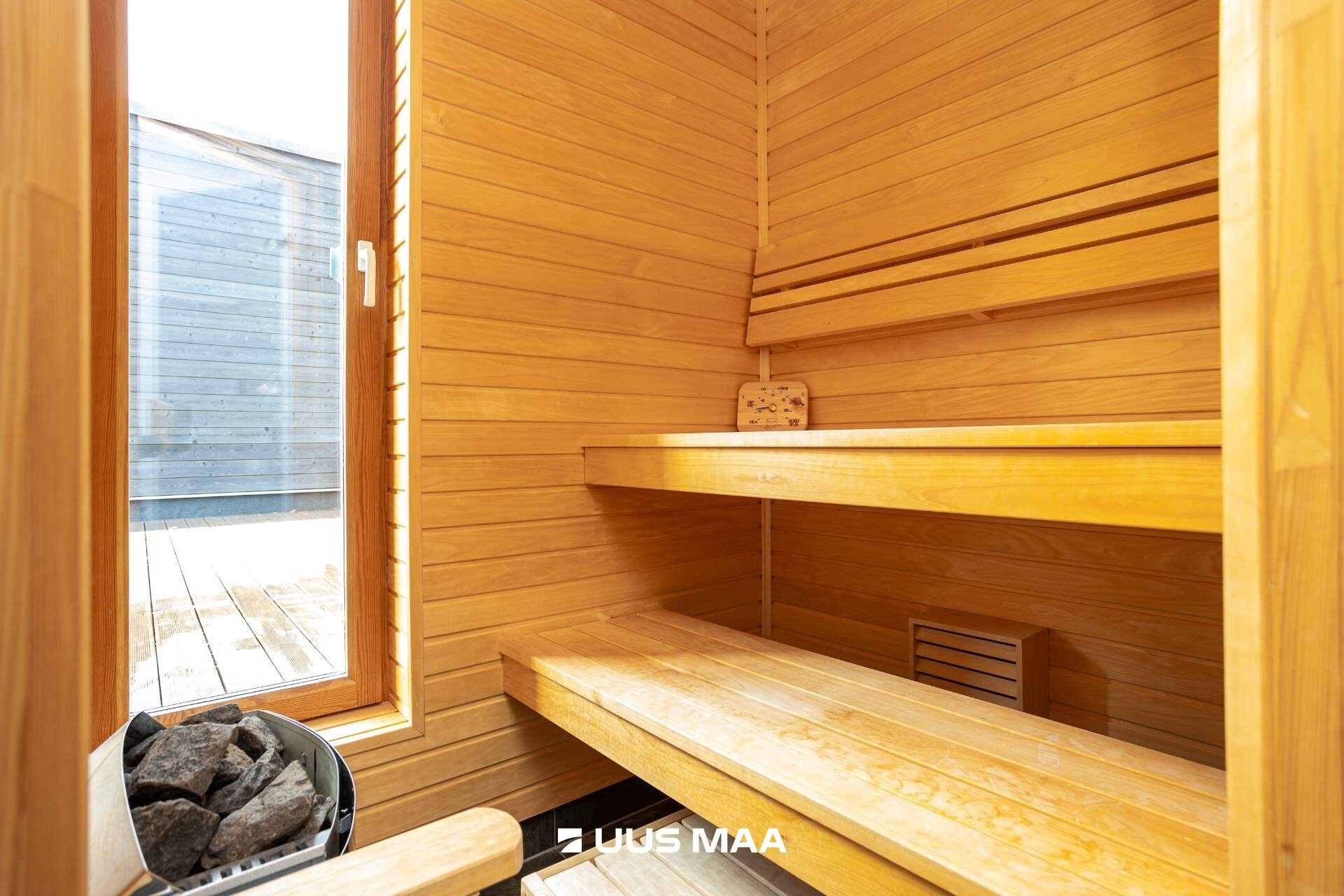 Second floor: three bedrooms, sauna, shower, outdoor terrace 40m2.