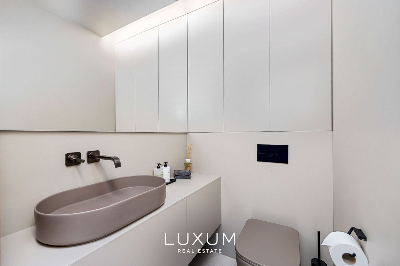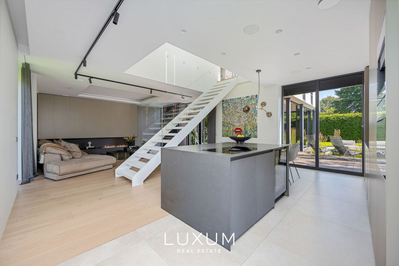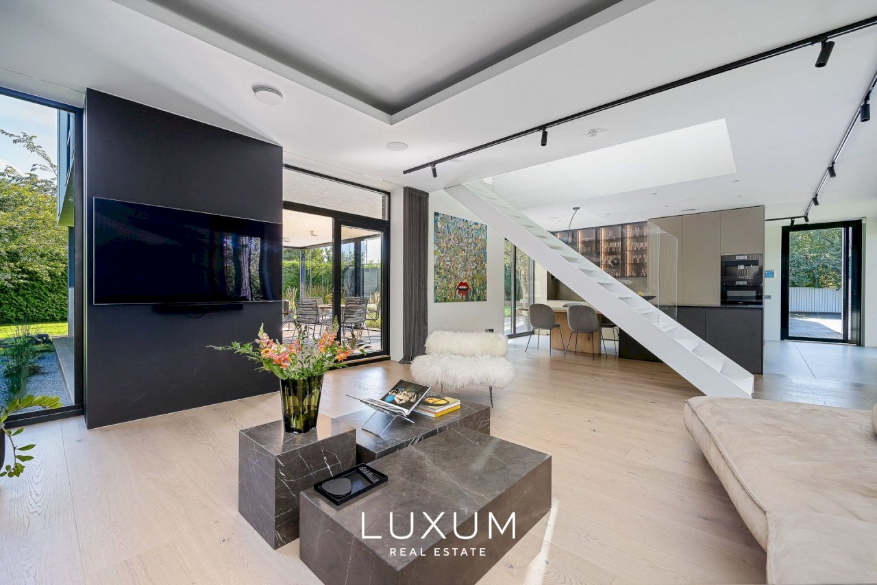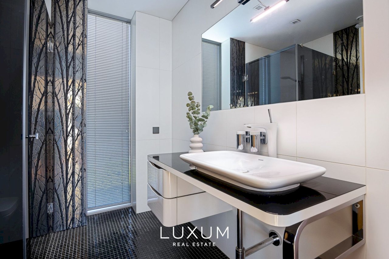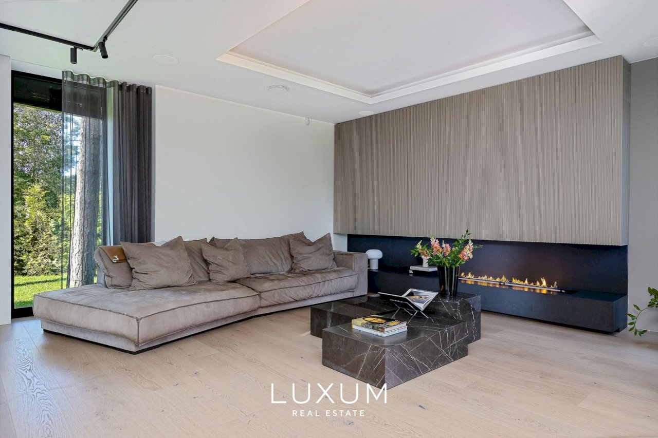 A spacious living room with a fireplace (24.3 m²), a kitchen (9.1 m²), a sauna complex (32.1 m²), an entertainment and sports room (23 m²), a utility room (20.3 m²) and a spacious terrace (16.8 m²) are located on the plinth floor of the building overlooking the pond.