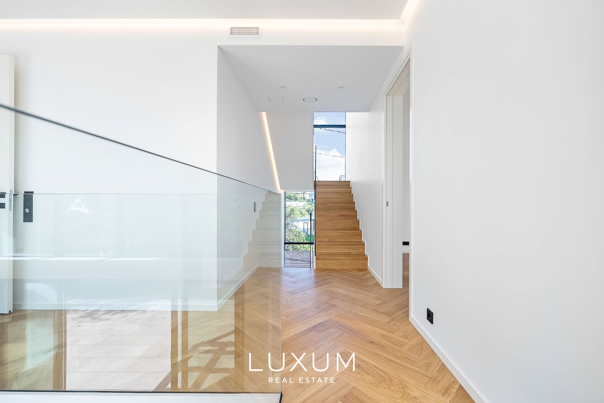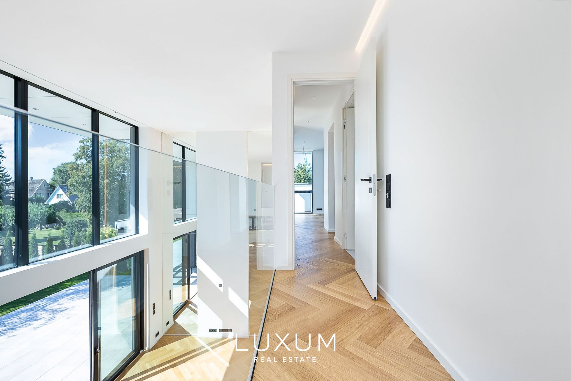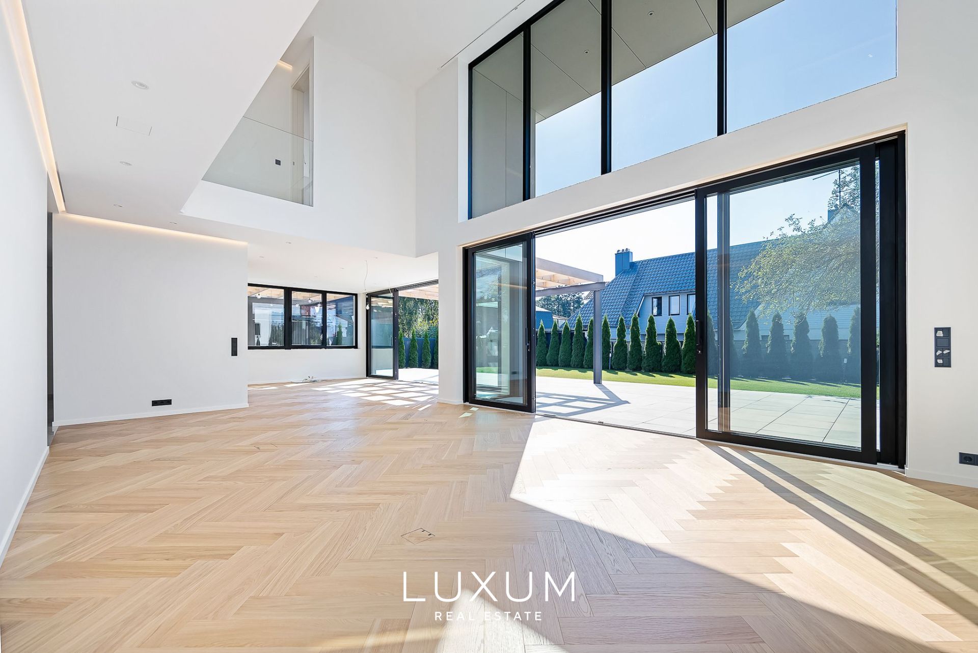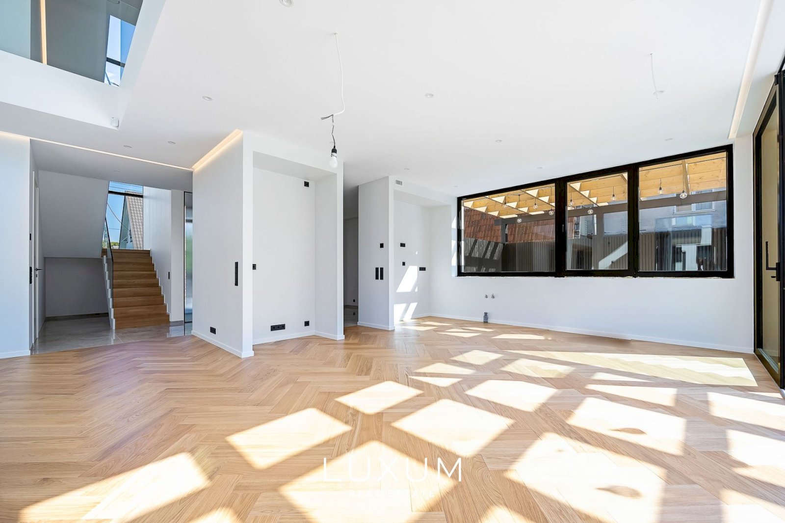 The layout has been carefully planned with the cardinal directions in mind – the northern side houses the entrance hall and most of the utility rooms. The living room, with a two-story high ceiling, and the terrace face southwest, while the children's rooms and kitchen open towards the morning sun.
