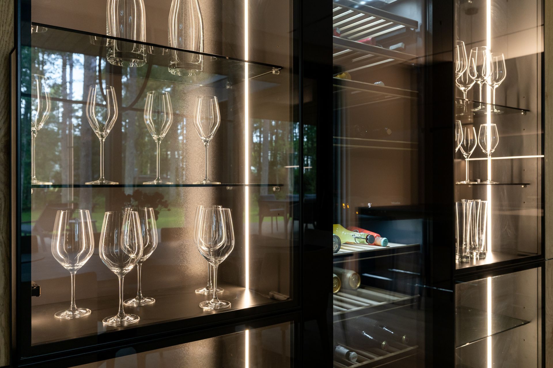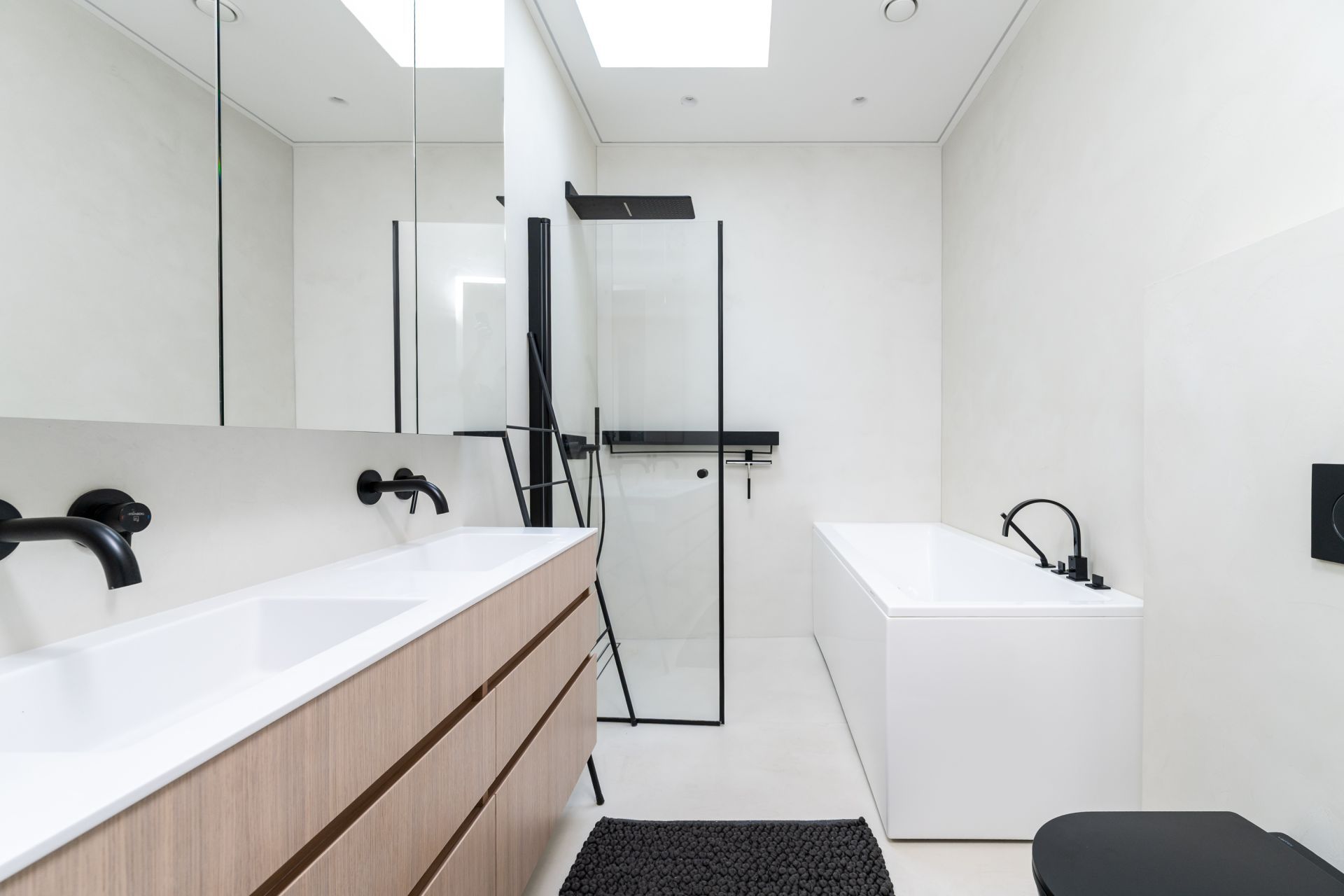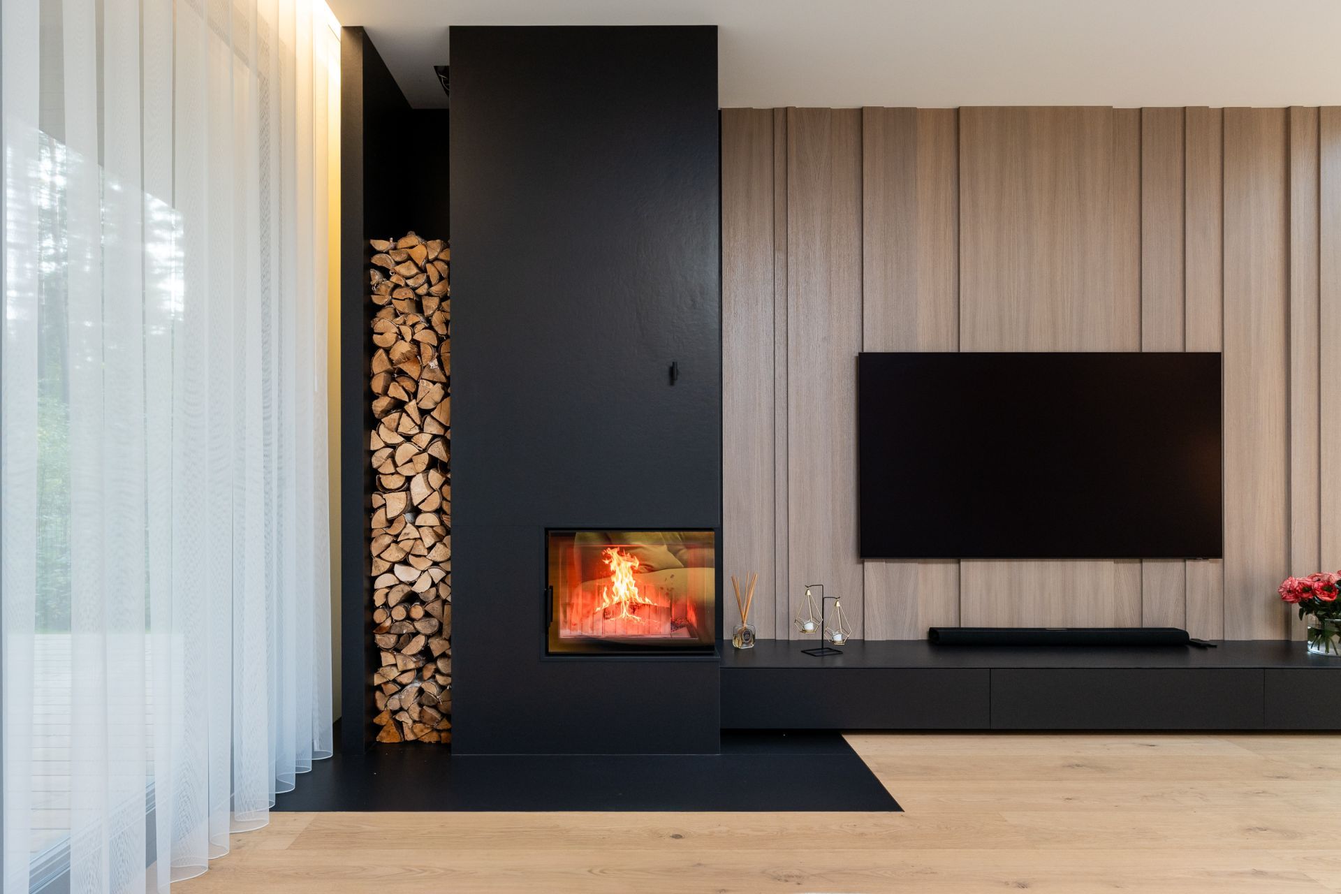 The stylish, high-quality kitchen is custom-made by Schmidt, equipped with Miele appliances, while the BORA system ensures an efficient cooking experience. The worktop and fireplace wall are finished with Dekton Sirius stone, which comes with a 25-year warranty. The kitchen’s design and materials create an elegant, timeless, and practical whole.