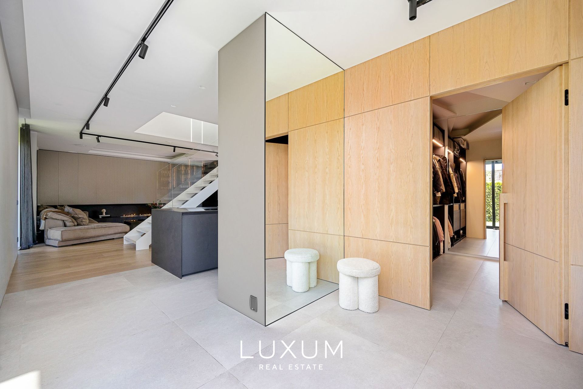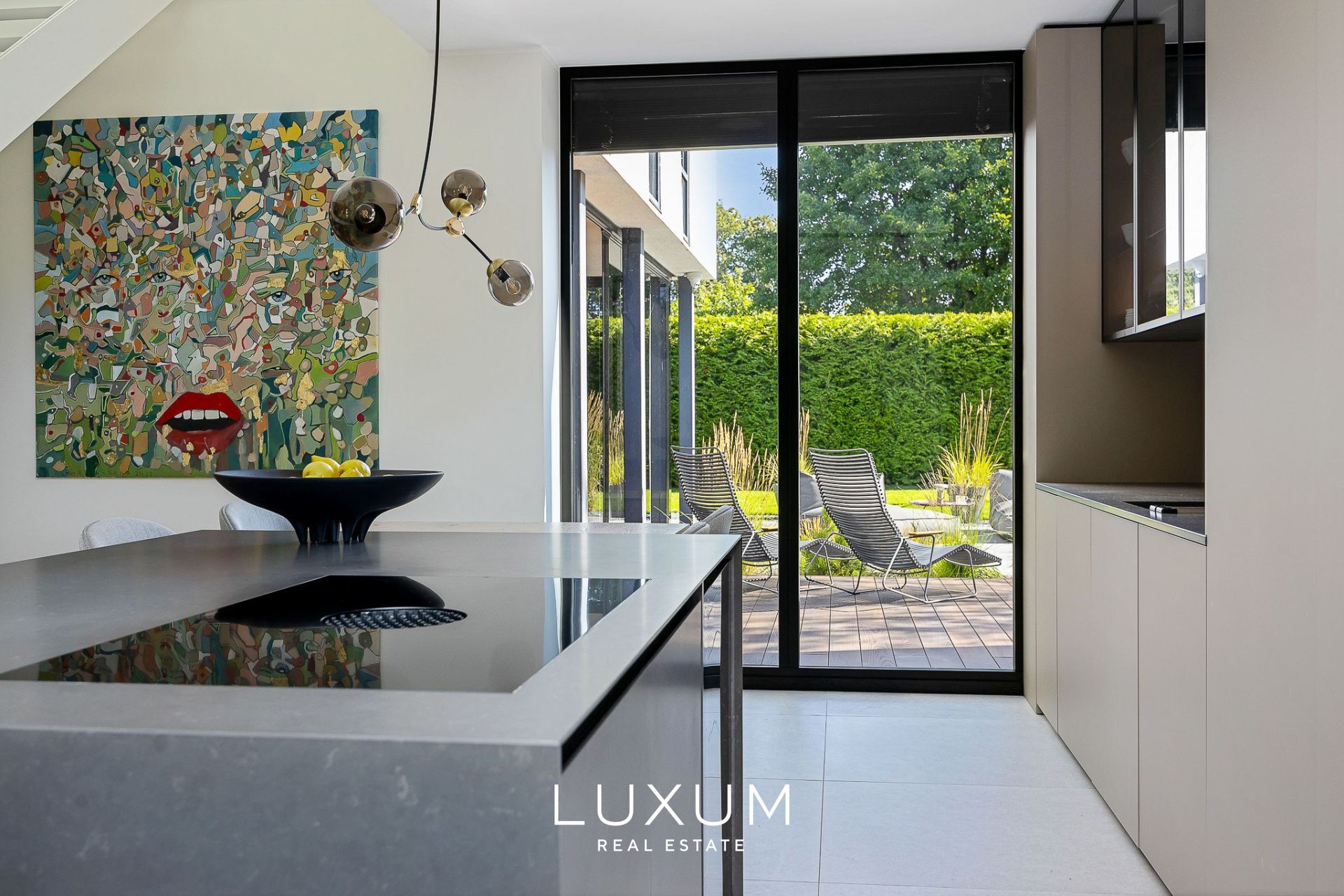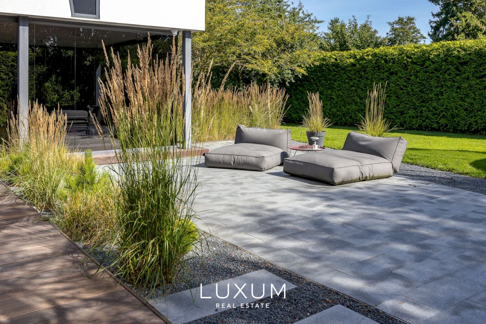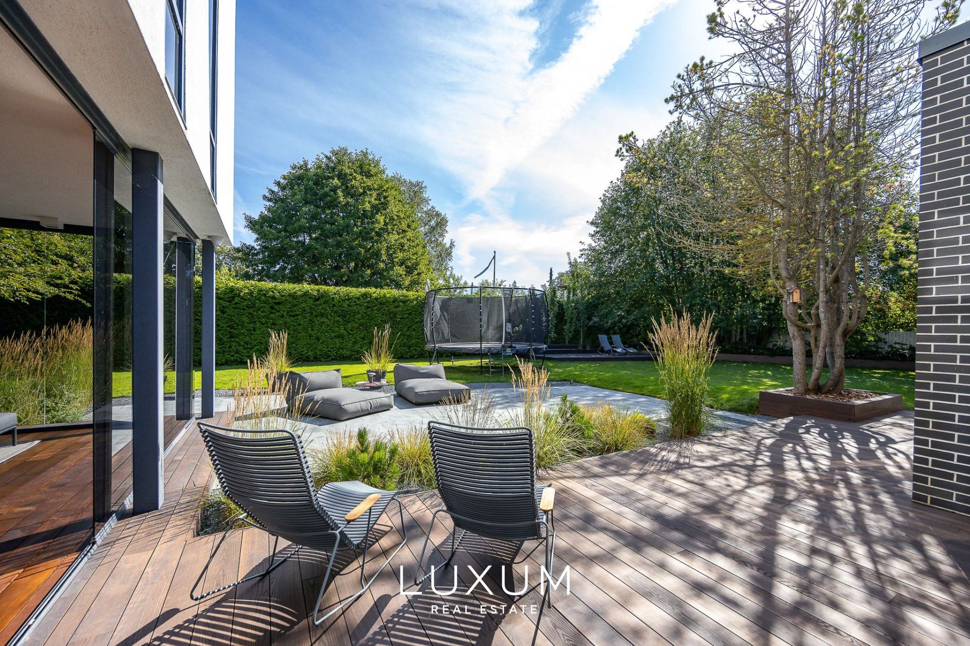 The architecture of the house is striking – sharp, contemporary lines balanced with warm material choices create a presence that opens gently to its natural surroundings while maintaining complete privacy. Floor-to-ceiling glass surfaces bring in natural light and beautiful views, while a glazed terrace extends the living area outdoors, making it an all-season sanctuary. The landscaping is minimalist and inspired by the coastal setting, offering a harmonious blend of modern design and lush greenery.