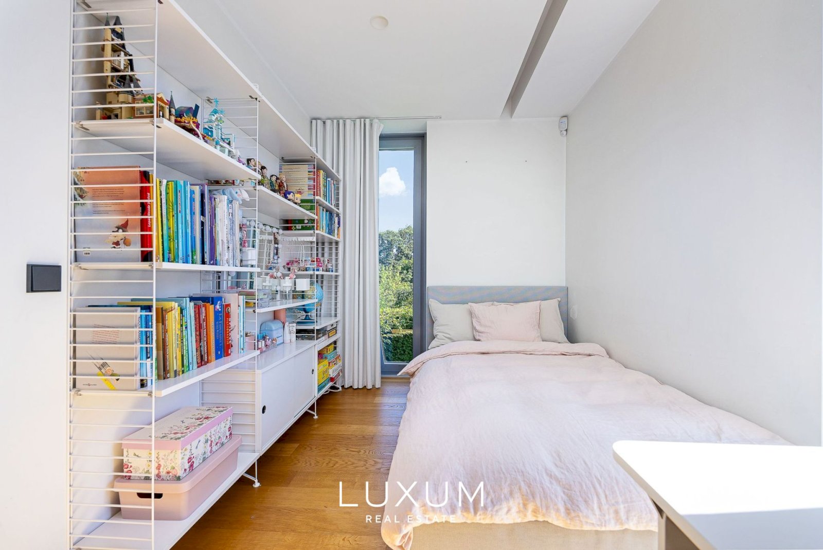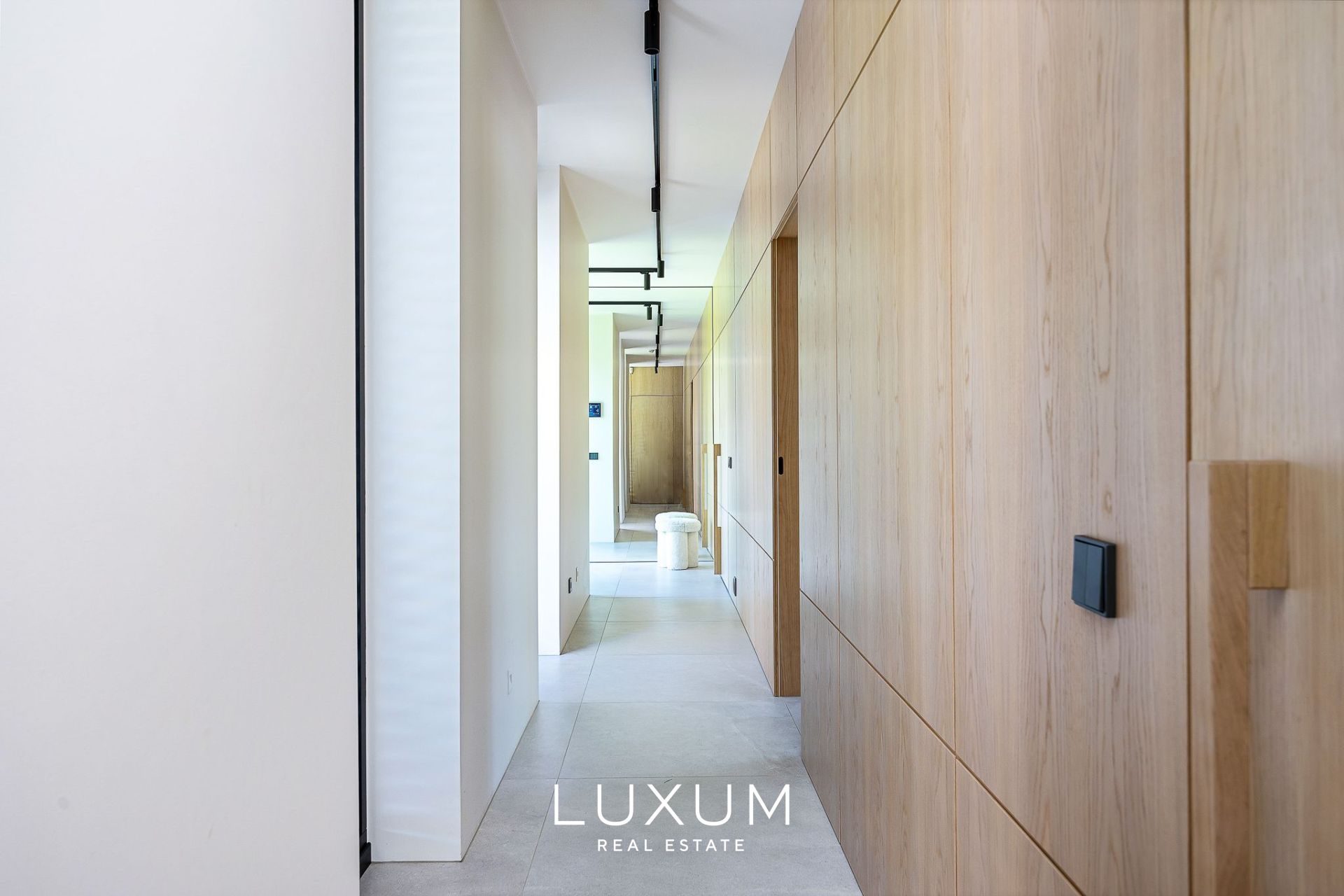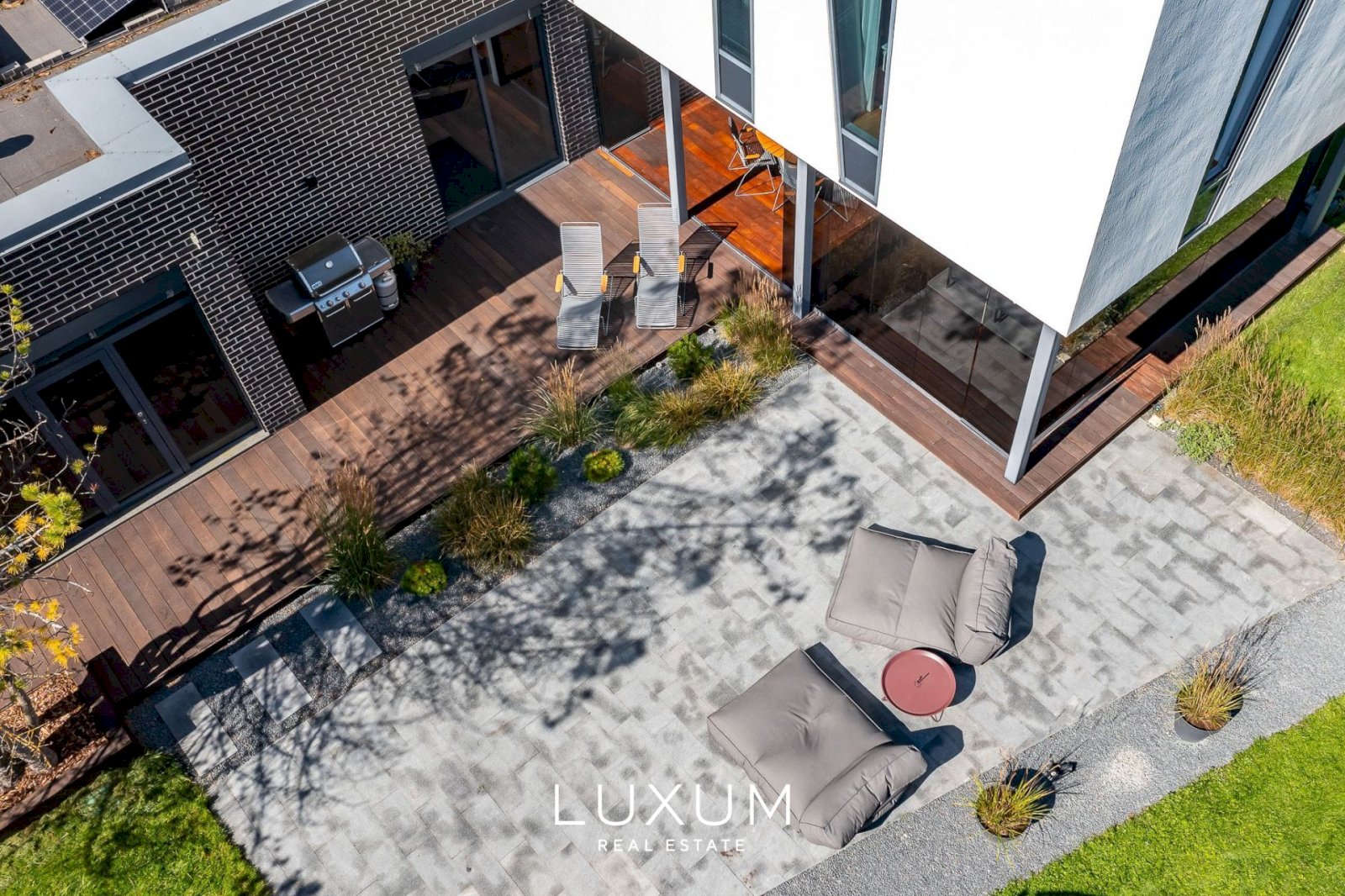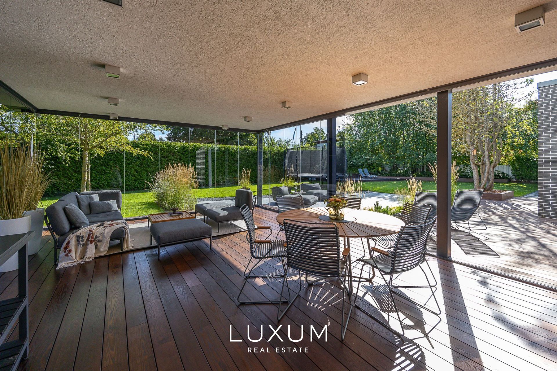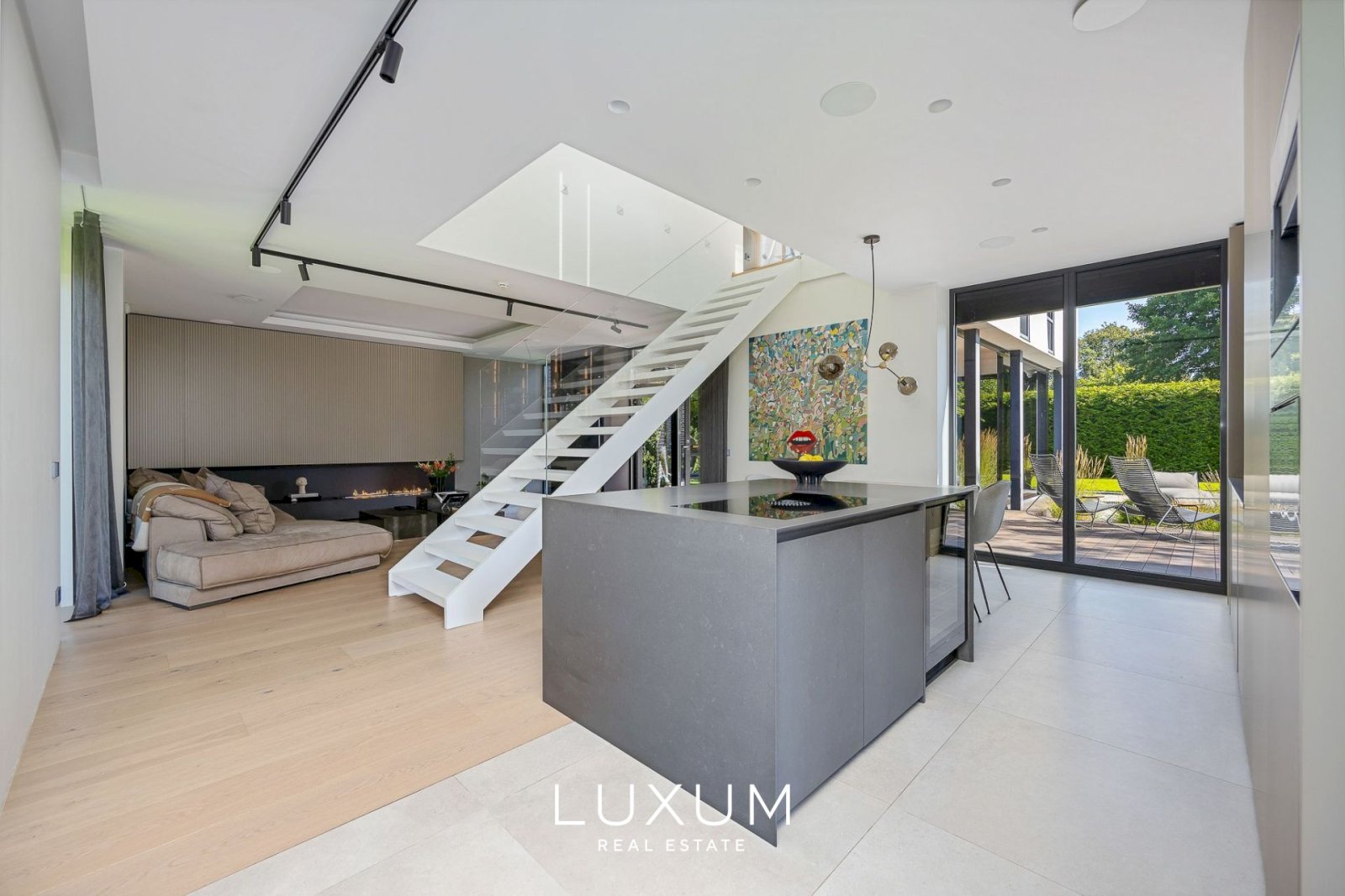 The architecture of the house is striking – sharp, contemporary lines balanced with warm material choices create a presence that opens gently to its natural surroundings while maintaining complete privacy. Floor-to-ceiling glass surfaces bring in natural light and beautiful views, while a glazed terrace extends the living area outdoors, making it an all-season sanctuary. The landscaping is minimalist and inspired by the coastal setting, offering a harmonious blend of modern design and lush greenery.