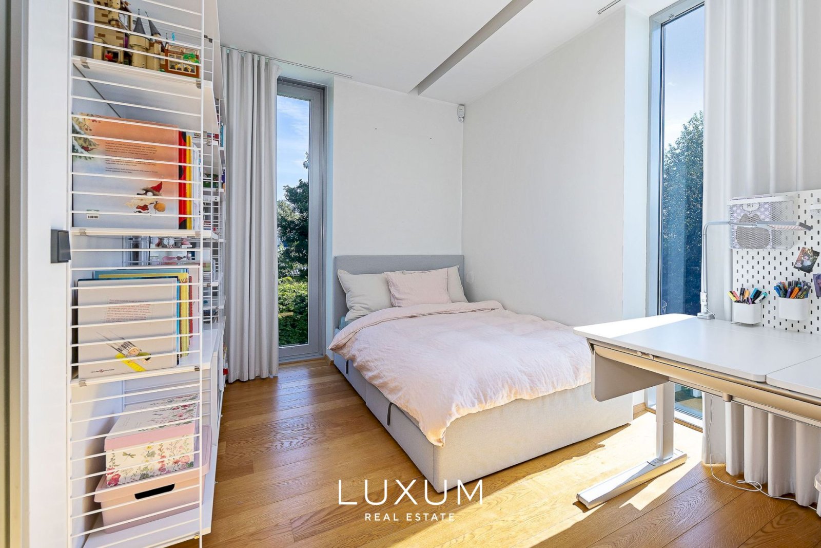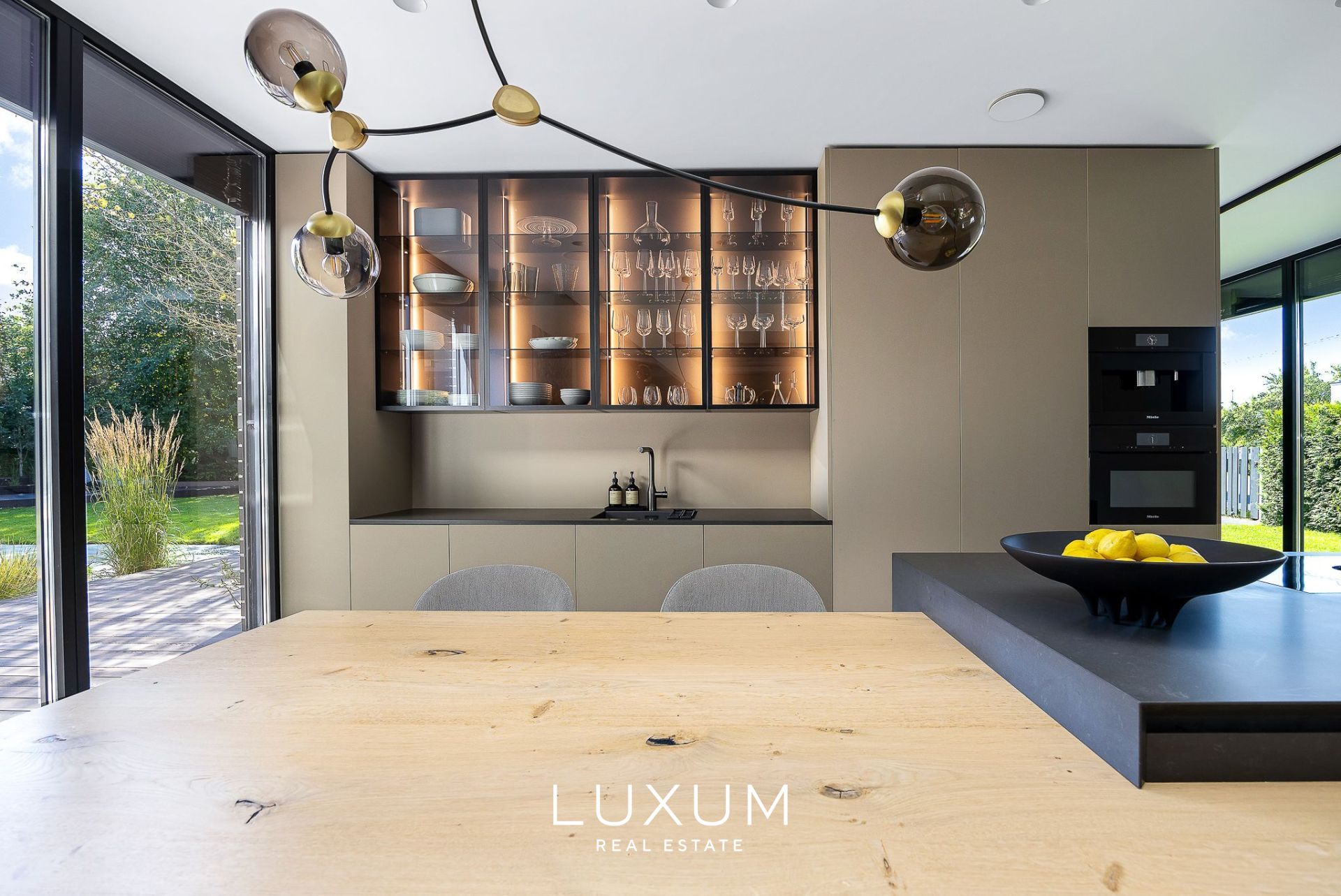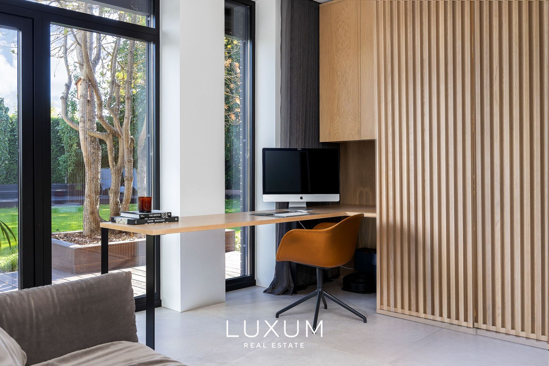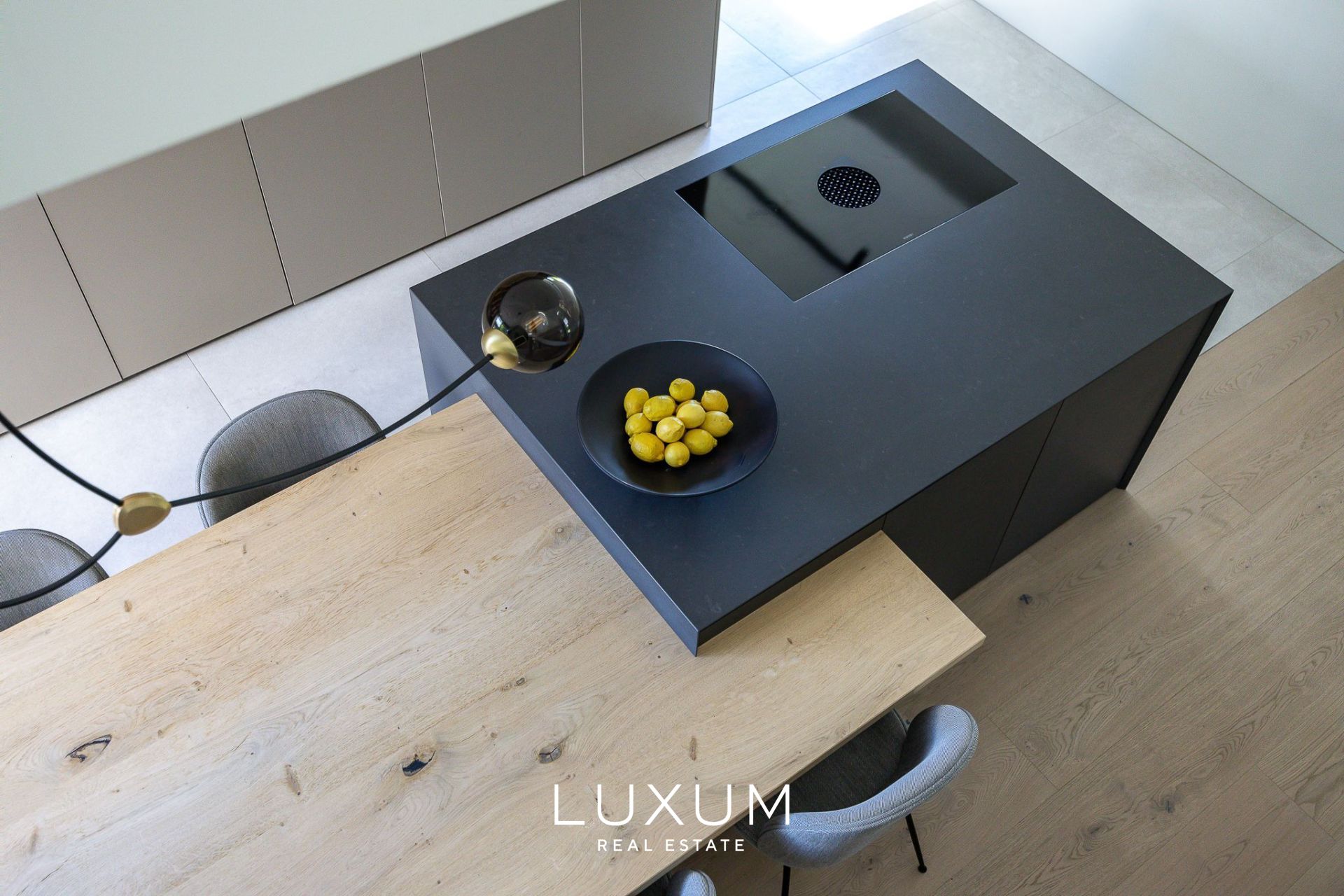 The architecture of the house is striking – sharp, contemporary lines balanced with warm material choices create a presence that opens gently to its natural surroundings while maintaining complete privacy. Floor-to-ceiling glass surfaces bring in natural light and beautiful views, while a glazed terrace extends the living area outdoors, making it an all-season sanctuary. The landscaping is minimalist and inspired by the coastal setting, offering a harmonious blend of modern design and lush greenery.