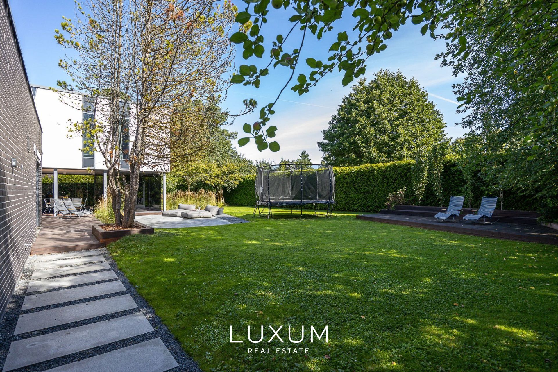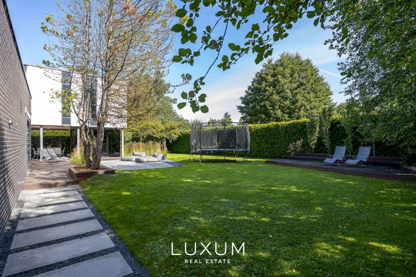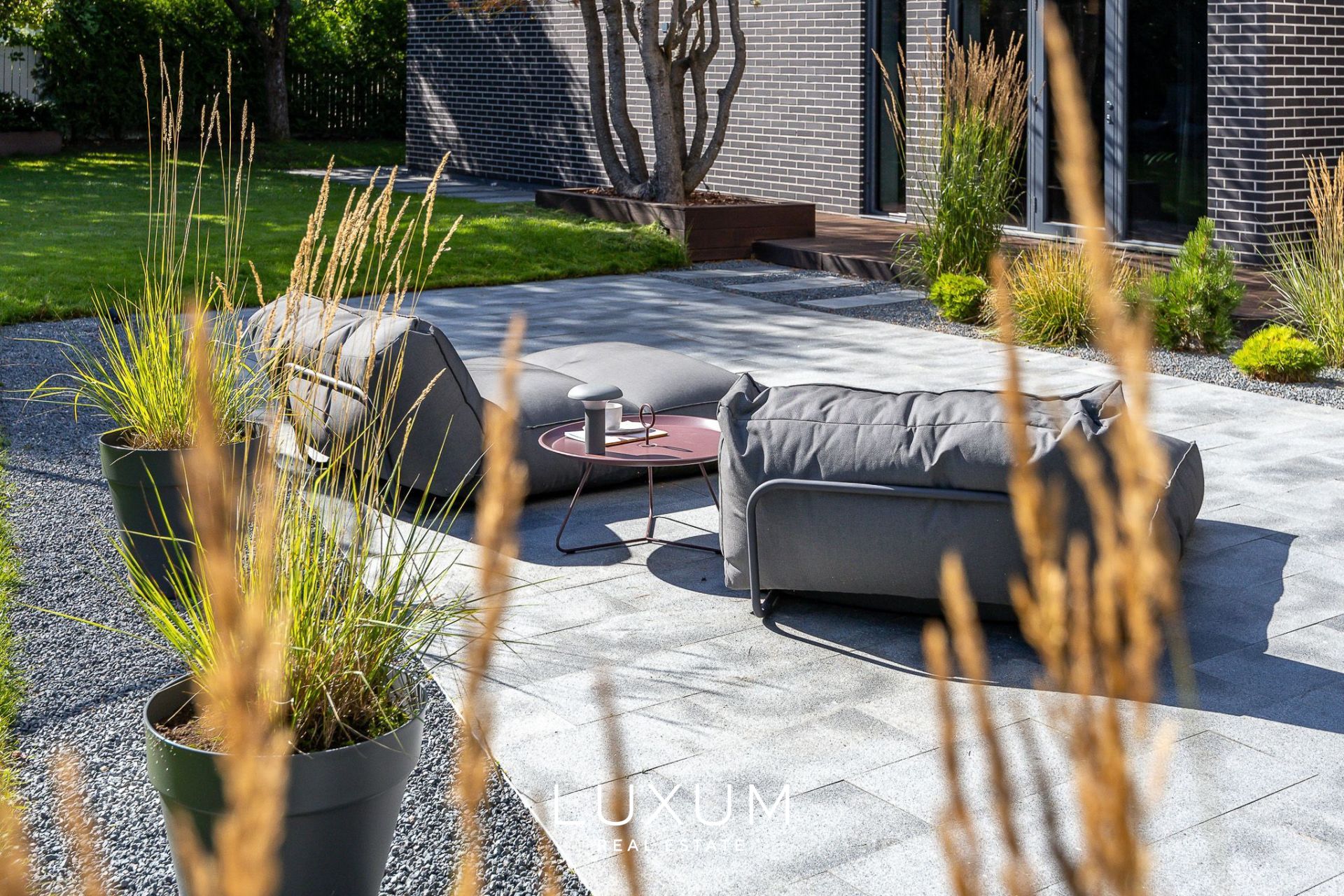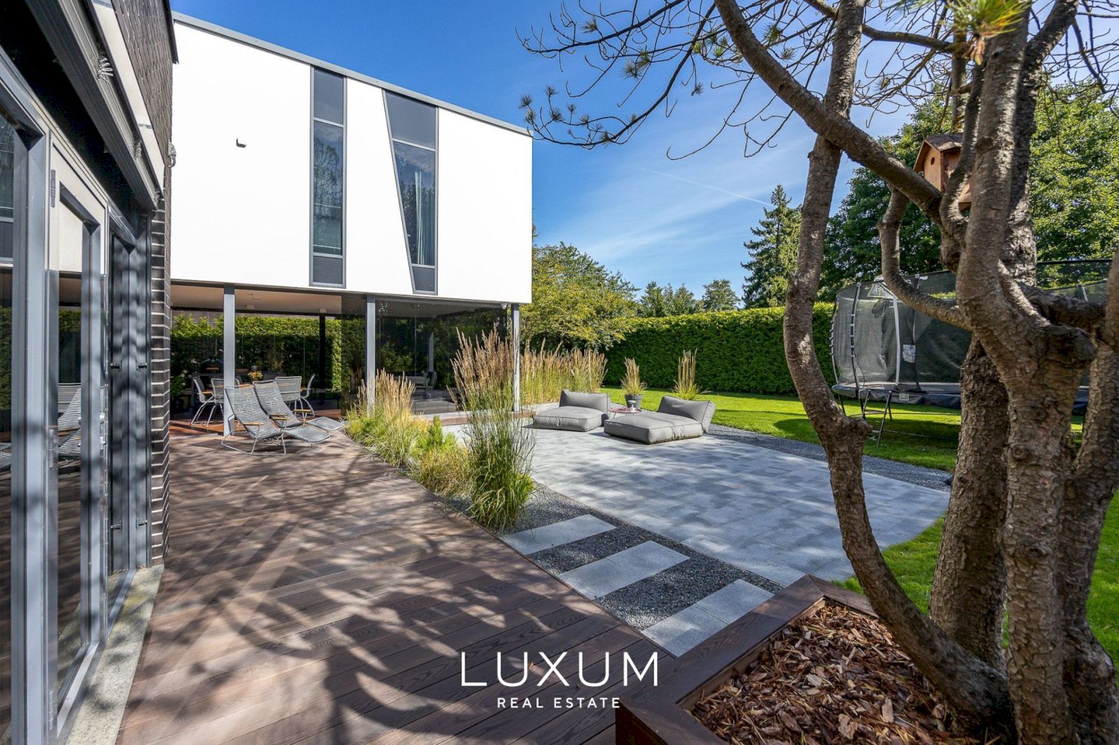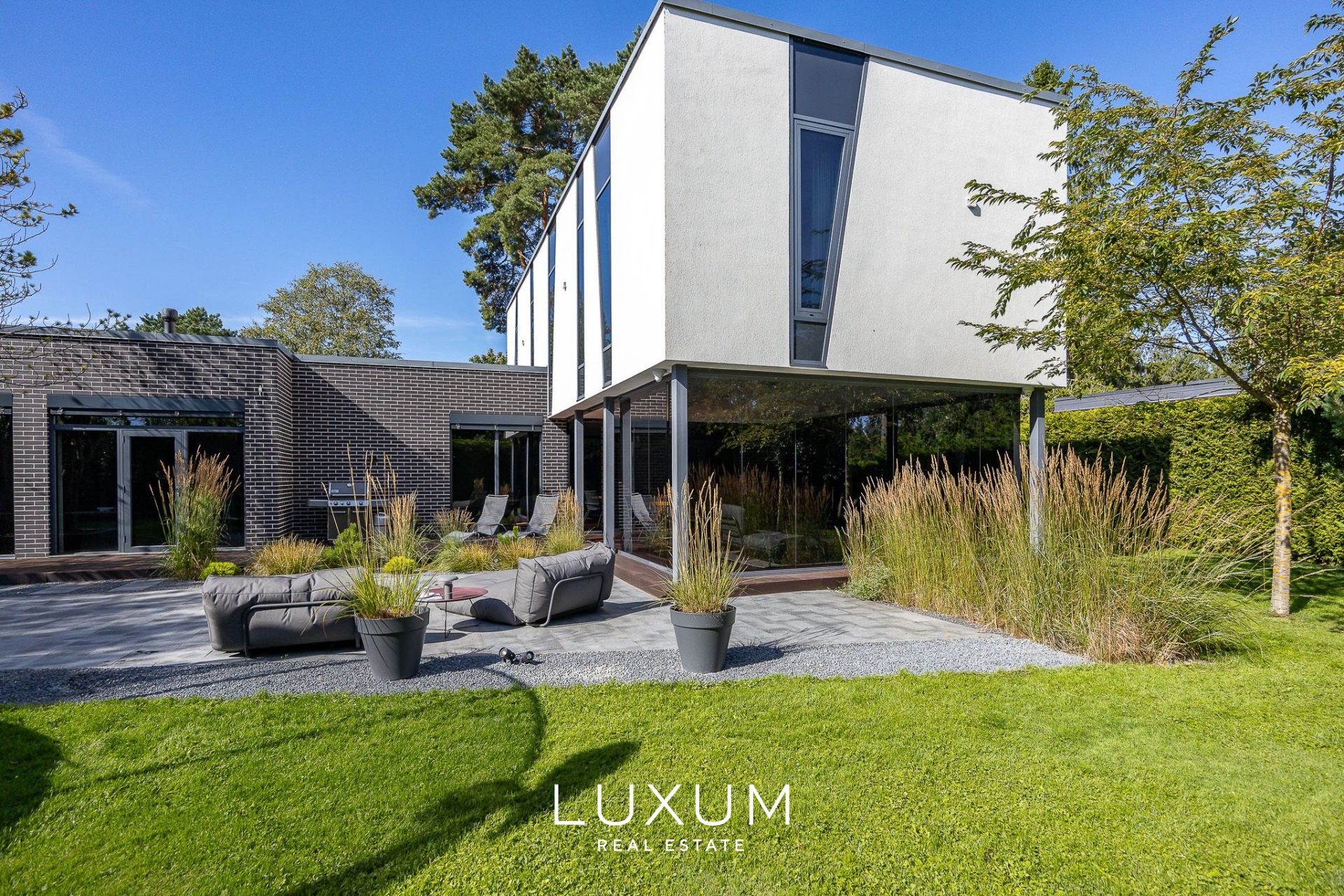 The architecture of the house is striking – sharp, contemporary lines balanced with warm material choices create a presence that opens gently to its natural surroundings while maintaining complete privacy. Floor-to-ceiling glass surfaces bring in natural light and beautiful views, while a glazed terrace extends the living area outdoors, making it an all-season sanctuary. The landscaping is minimalist and inspired by the coastal setting, offering a harmonious blend of modern design and lush greenery.