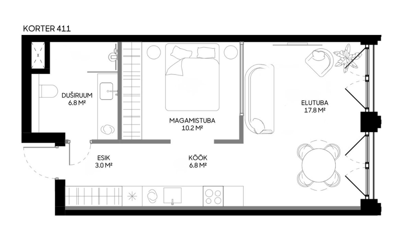 This 44.7 m² two-room home offers a well-balanced and thoughtfully designed layout where every square metre serves a clear purpose. The living room and kitchen form a unified, open space that works equally well for everyday living and hosting guests.