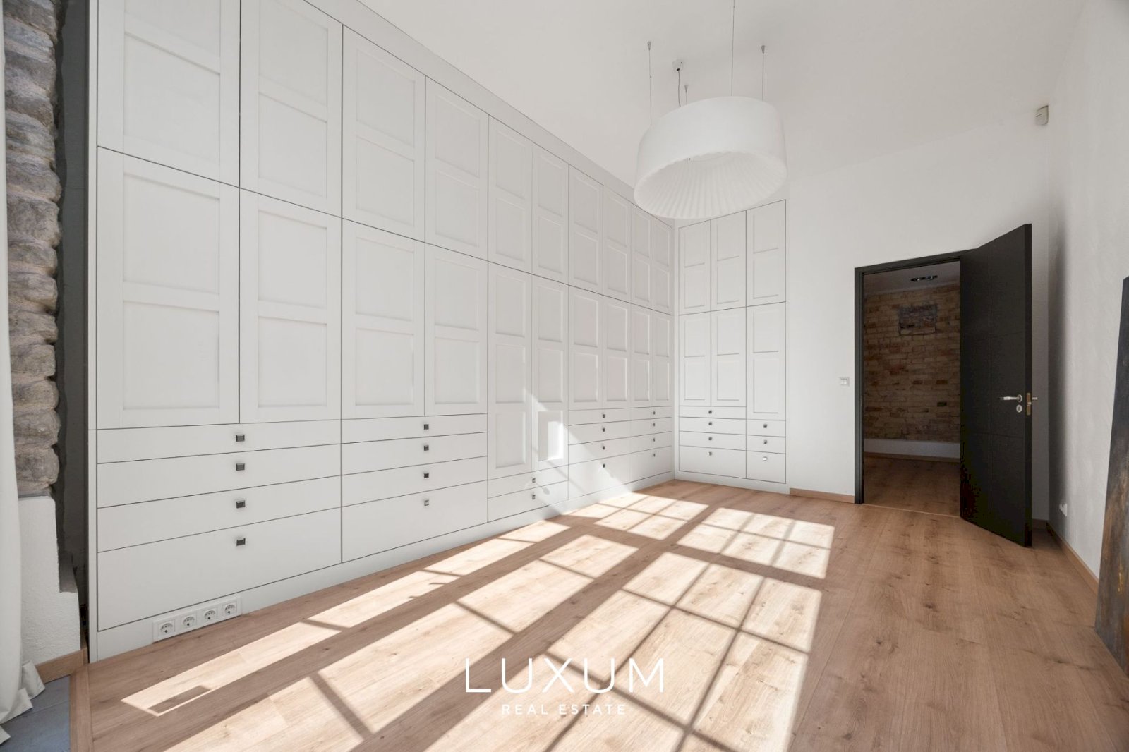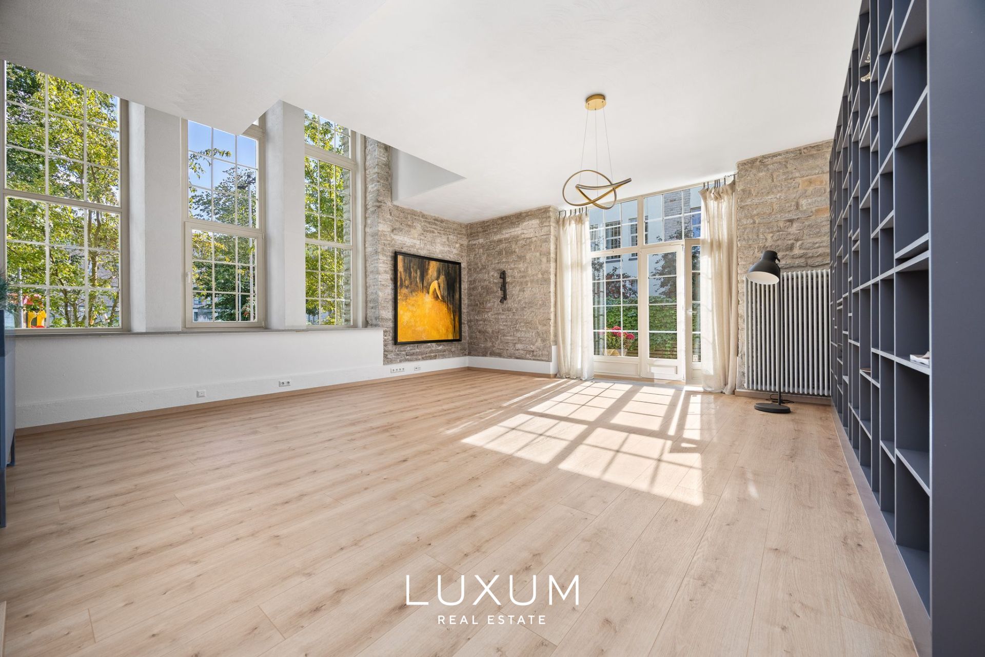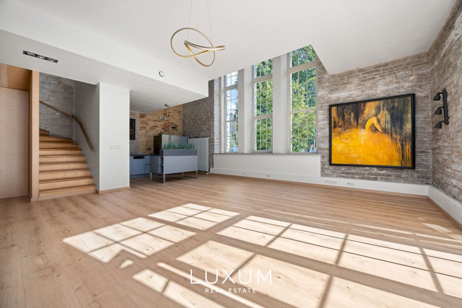 Majesteetlik elutuba koos avatud köögiga, kus valgus ja kõrgus loovad erakordse atmosfääri.