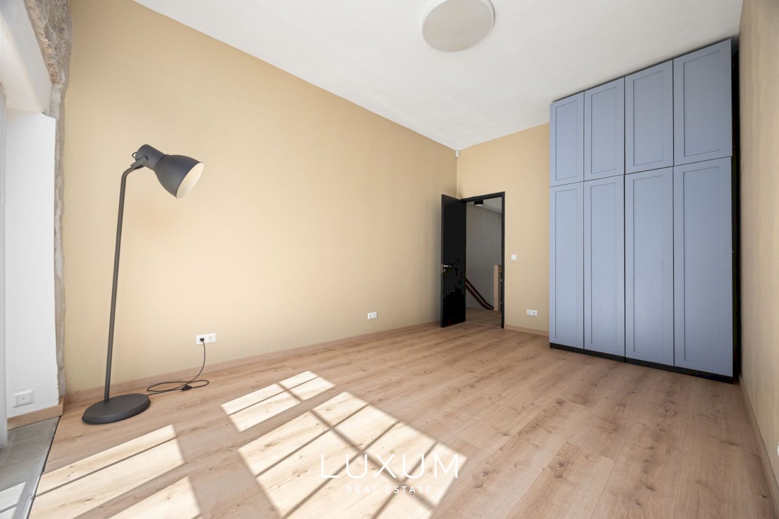 Magamistuba koos mahuka sisseehitatud garderoobikapiga ja ligipääsuga terrassile – ideaalne hommikukohvi nautimiseks.