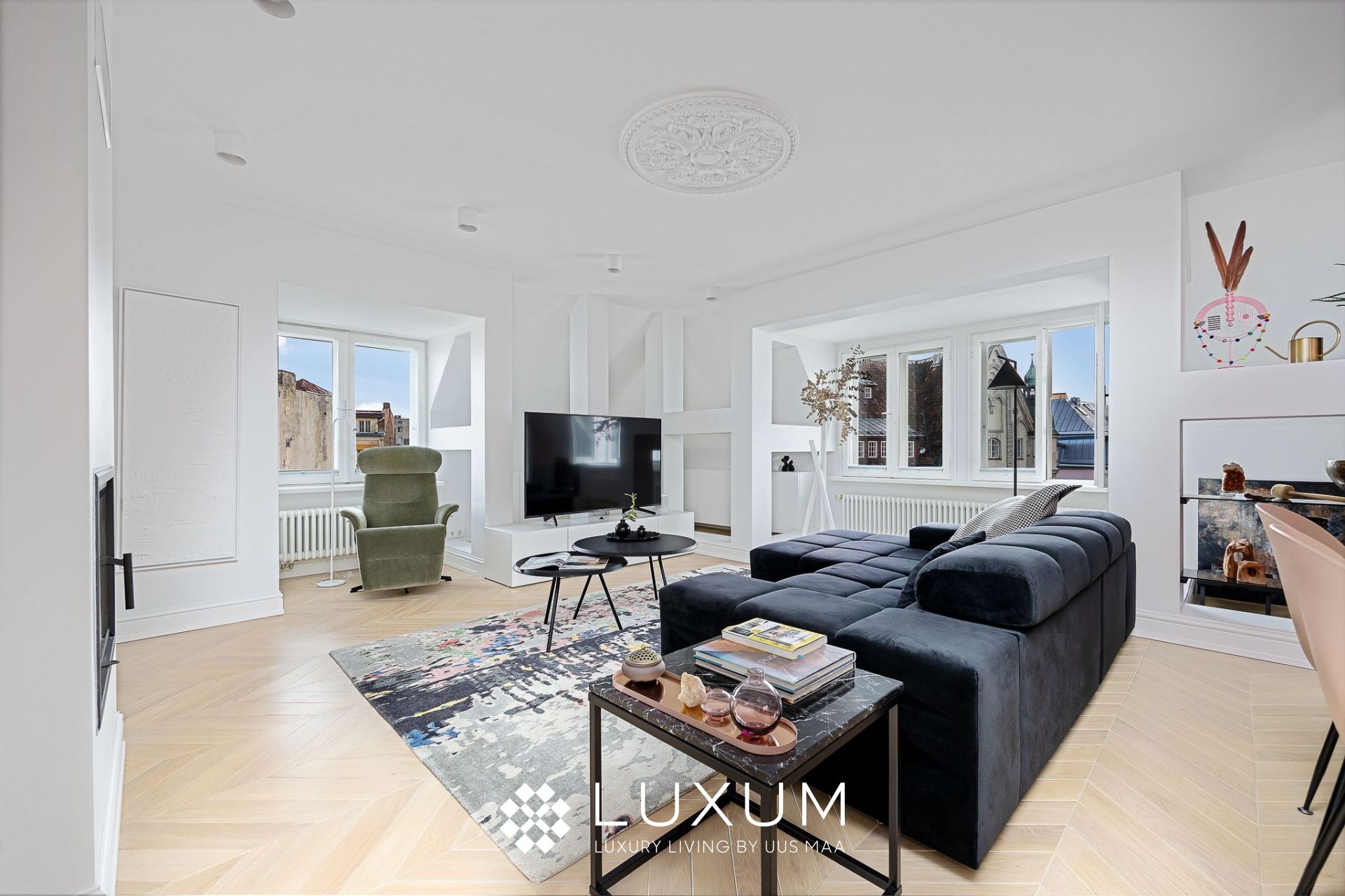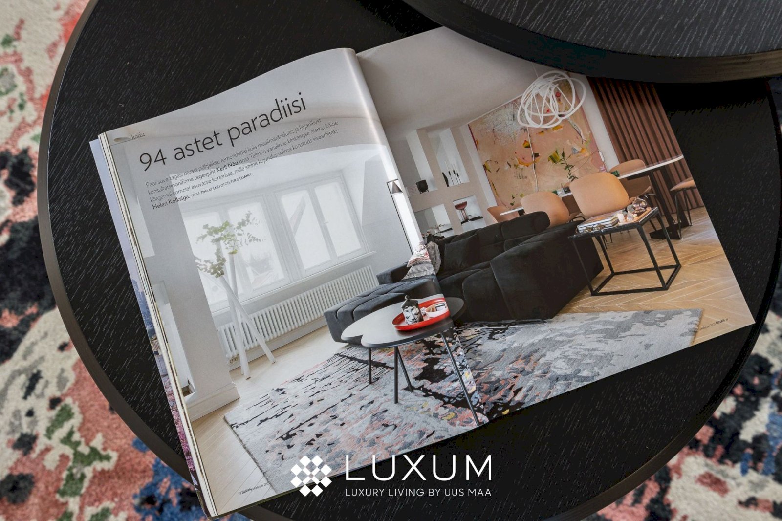 Sisearhitekt Helen Kolks on loonud interjööri, mis on sama peen kui funktsionaalne. Kogu korteri mööbel ja arhitektuursed lahendused on valminud rätsepalahendusena – kaasaarvatud elutoa käsitöö villa-siidivaip.