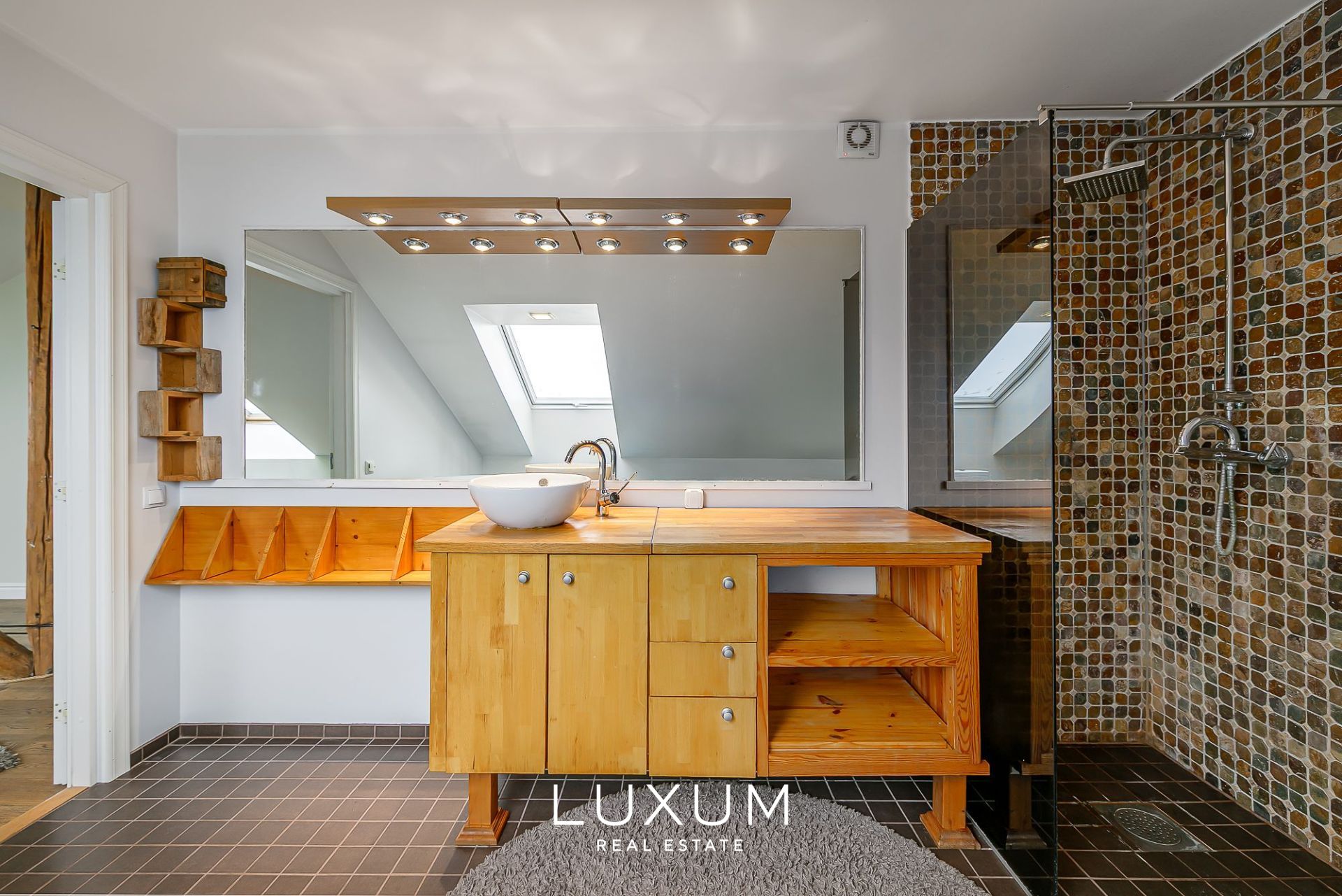 Heledad toonid ja looduslikud materjalid, säilitatud on ehitusaegsed palktalad, mis loovad hubase ja sooja meeleolu. Põrandatel paikneb naturaalne parkett, vannitoas looduslik kivi, esikus graniitplaat.
