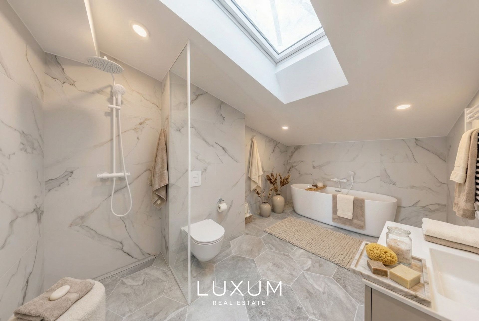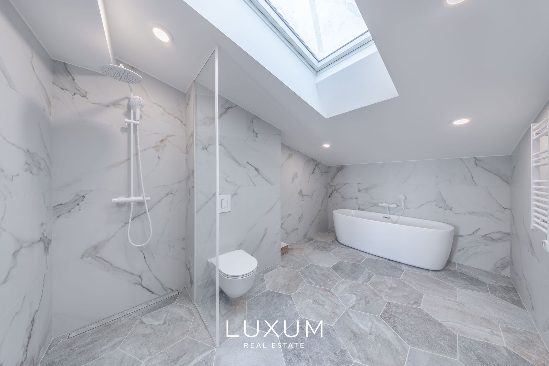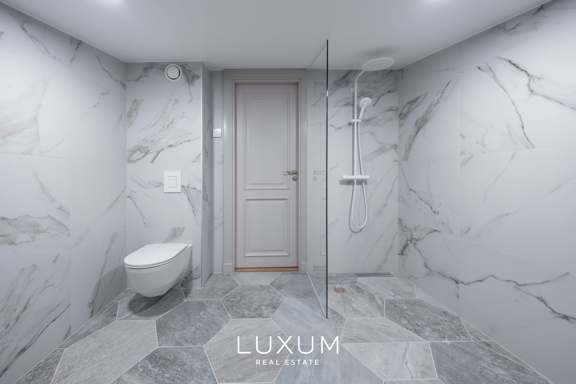 Kokku on korteris kaks vannituba, millest üks on vanniga. Viimistluses on kasutatud suureformaadilisi kiviplaate ning neutraalset, ajatut materjalikeelt. Eluruumides loovad soojust kalasabamustris tammepõrandad.